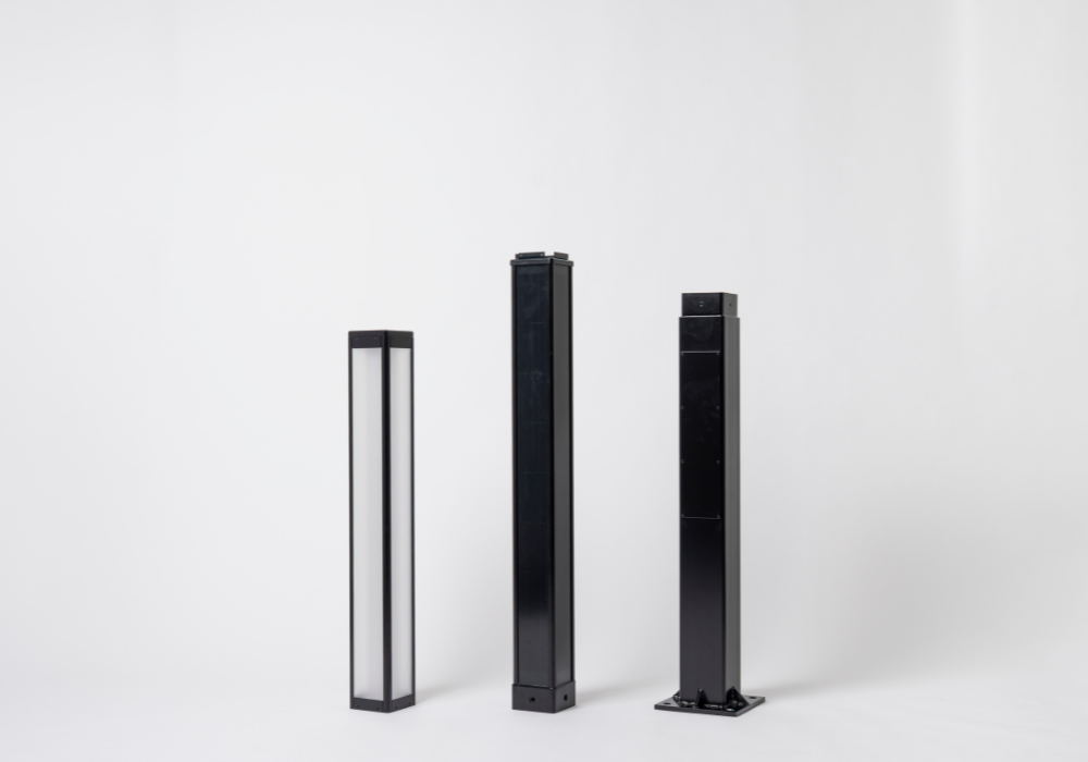 そこで、新たにソーラーパネルと支柱を一体化させた垂直配置ソーラーユニットを開発し、景観を損なわないスリムなデザインのソーラーLEDポールライト「ルメナイト」を第一弾製品として発売します。「ルメナイト」は、照明部、ソーラー部、蓄電部を3分割にしてユニット化することで、それぞれのユニットは重機を使用することなく人力で持ち運びができ現場で容易に組み立てることが可能です。