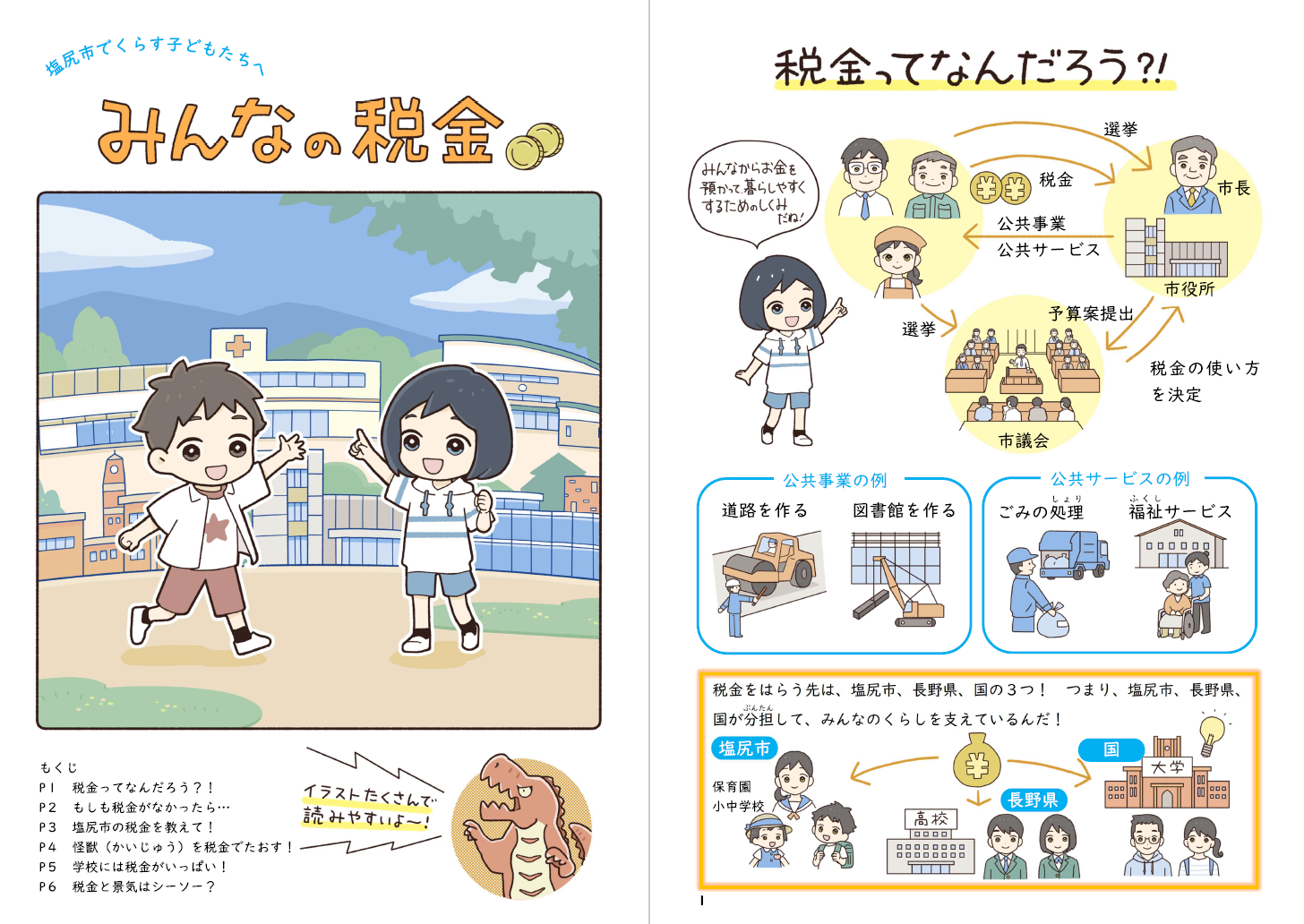 塩尻市・塩尻市租税教育推進協議会では、「みんなの税金」を作成し、塩尻市立小学校全9校の6年生に配布しました。市内のイラストレーター兼デザイナーの溝口史恵さん(令和2年度長野県警察「少年問題に関する4コマ漫画」審査員特別賞受賞)と共に制作しました。内容はすべてオリジナルです。