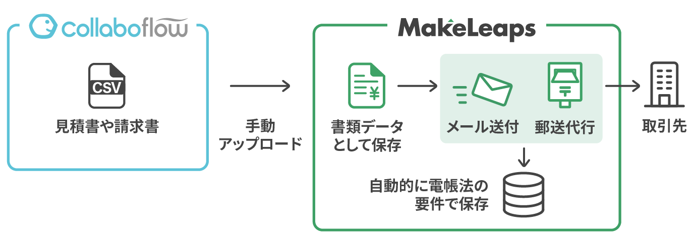 今回のサービス連携を利用することにより、「コラボフロー」より出力した請求書データを簡単に「MakeLeaps」に連携します。連携したデータは書類情報として登録されるため、書類作成後の郵送・電子送付や入金業務が「MakeLeaps」で一元管理できます。