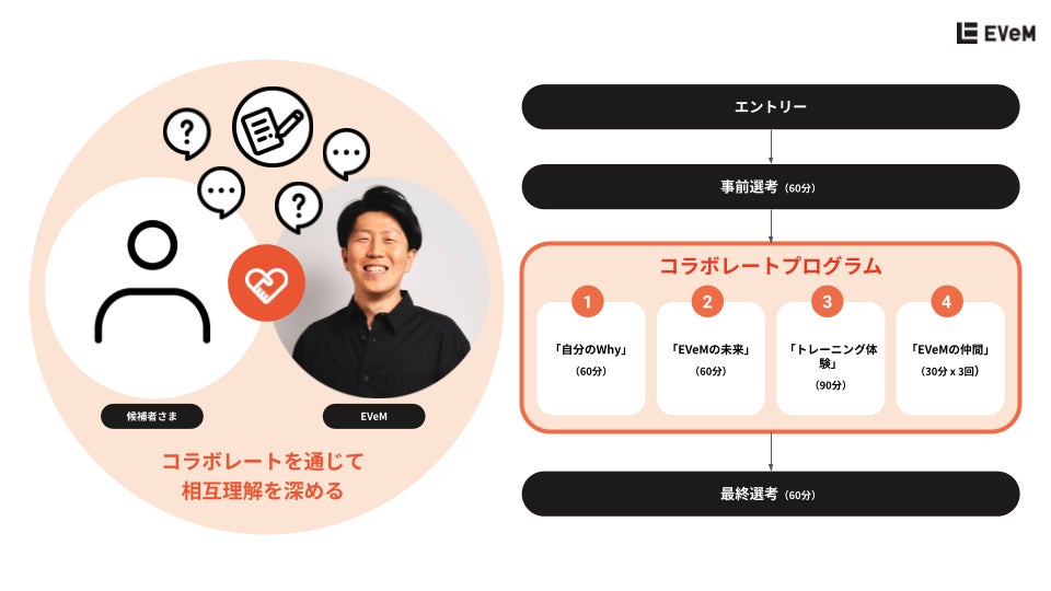 ベンチャー企業のCxO・マネージャー向けトレーニングプログラムを提供する株式会社EVeM(本社:東京都新宿区 代表:長村禎庸)は、候補者さまとEVeMがコラボレートするプロセスを通じてお互いのことをよく知り・理解し、双方が高い精度で合う合わないを見極めることができる「コラボレート選考」をトレーナー職種「EVeM Management Trainer」(以下、トレーナー)の採用プロセスにて導入を開始したことをお知らせします。