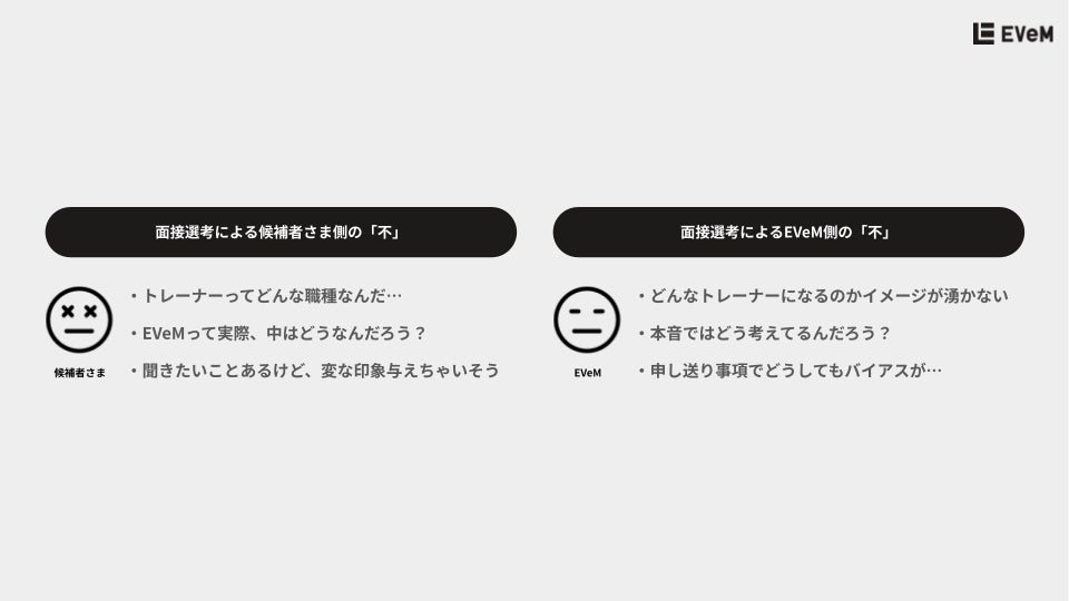 候補者の方の人生において、大切な時間をEVeMで過ごしていただきたい。転職は簡単には決められない人生の選択であるからこそ、十分なプロセスを踏みたい。そんな思いがありながら、一般的な選考プロセスでは双方向の理解を十分に深められないという課題がありました。ユニークなジョブであるEVeMのトレーナーについてしっかりとご理解いただくこと、また、双方にとって後悔のない精度の高い見極めを行うことには一定の難しさがあったからです。