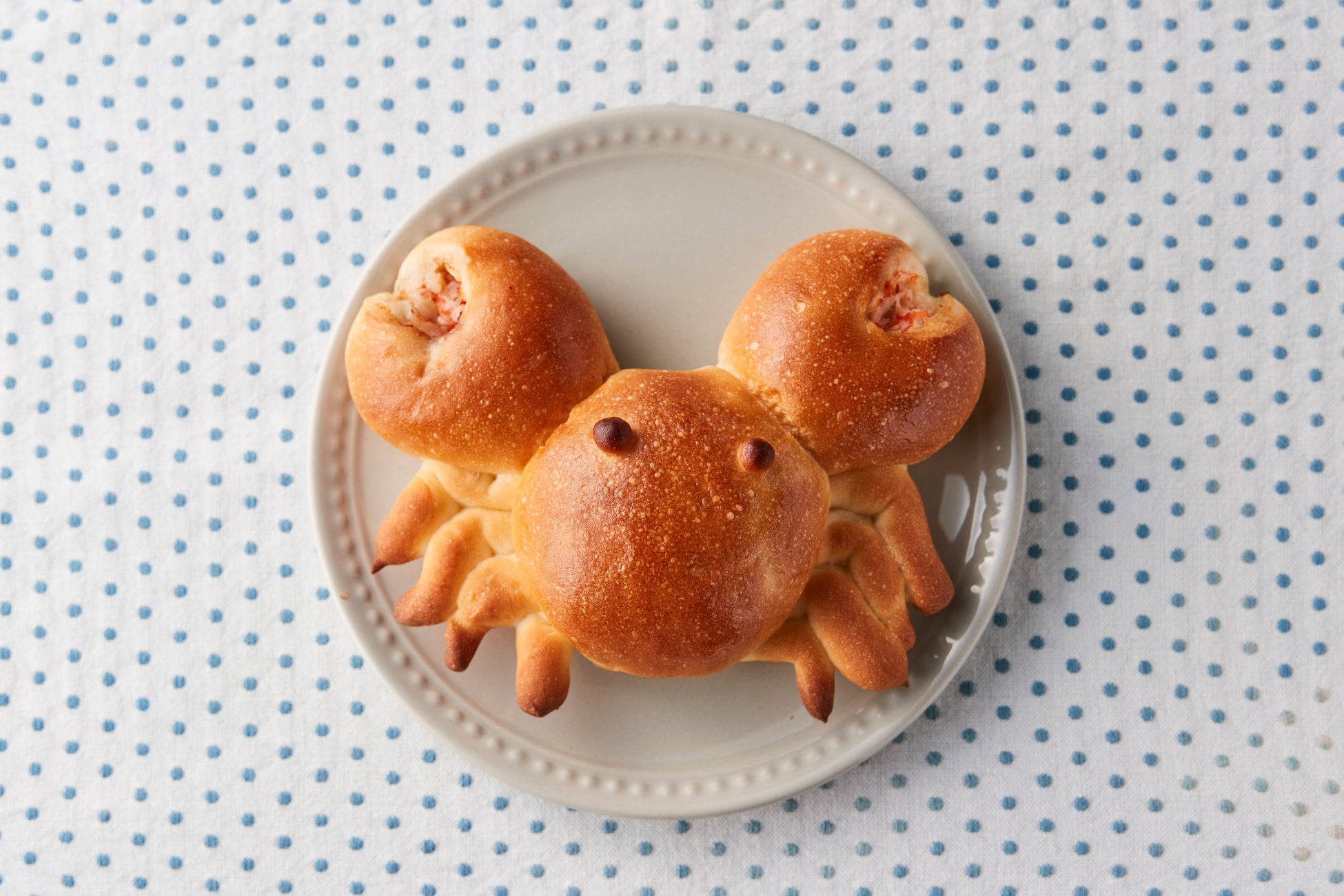 カネテツ「ほぼカニ」(カニカマ)使用。胴体に肉味噌と新玉ねぎ、ハサミには筍サラダが入った、ほぼカニづくしのパンです。販売価格:324円(税込)※平日10時~、土日祝9時~ 販売