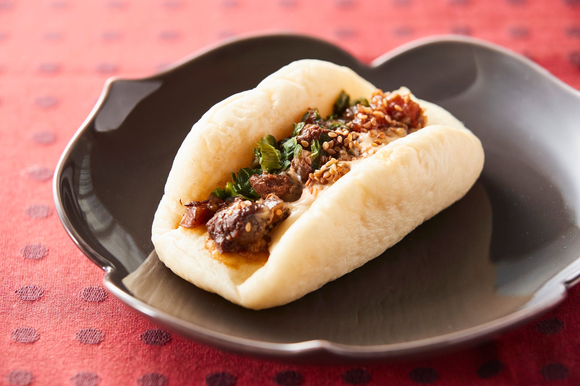 食べ応えのあるMCC「神戸長田牛すじぼっかけ」とソテーした玉ねぎをもっちりとしたナンでサンドに、2種のソース(金ゴマ・チーズ)を合わせました。販売価格:230円(税抜)※4月10日より販売