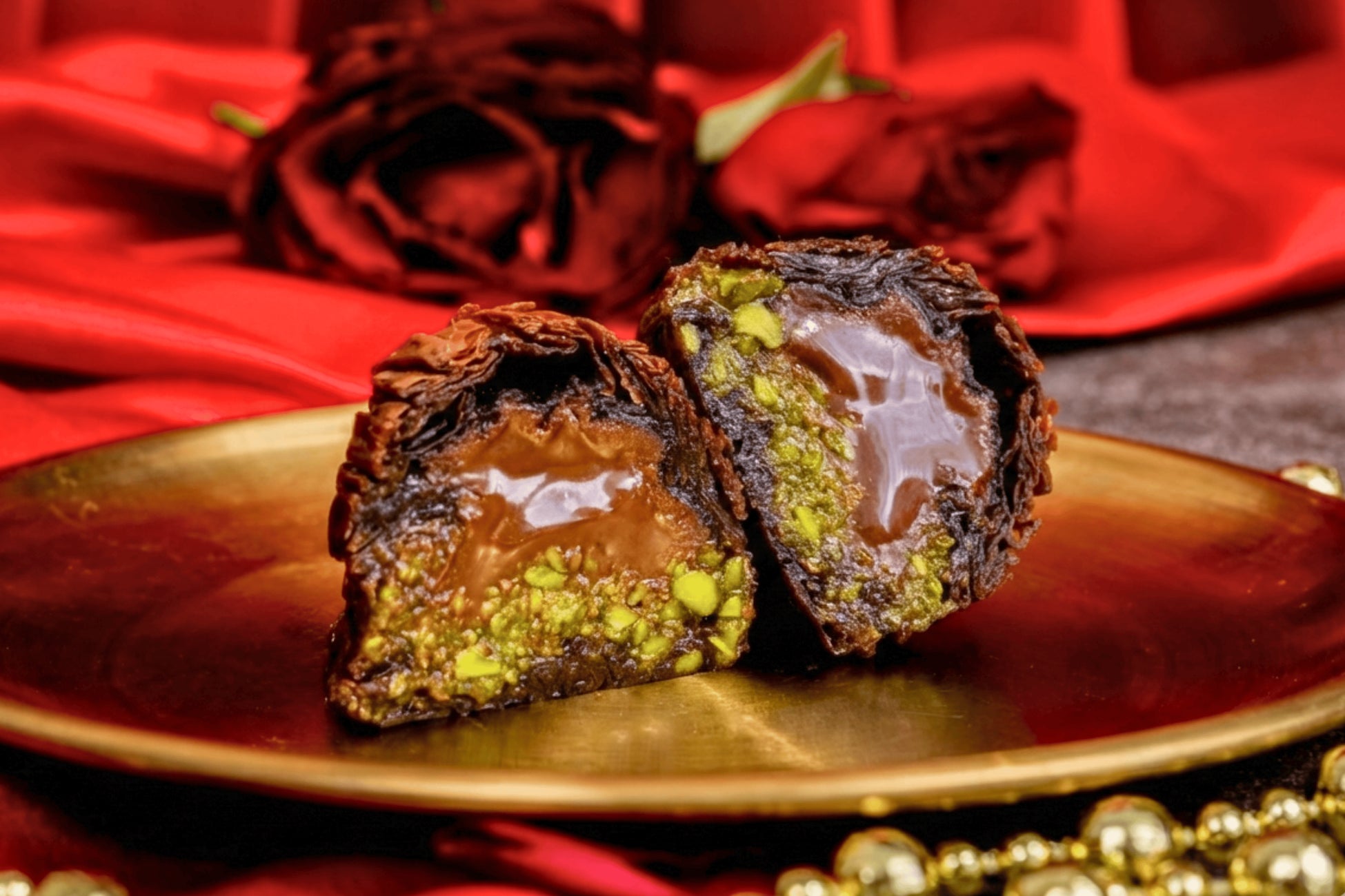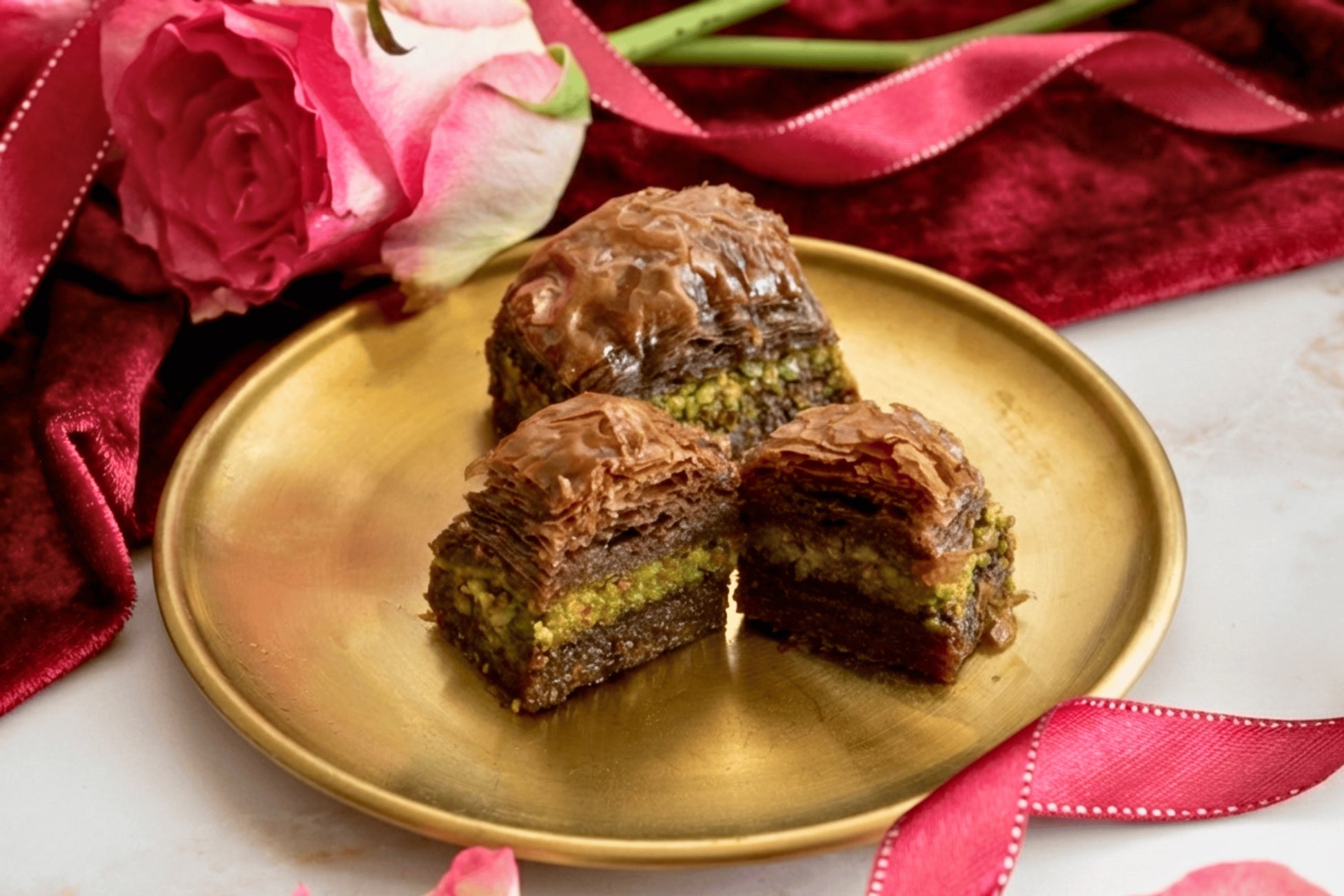 ぎっしり詰まったピスタチオと口どけの良いチョコレートが調和した、ひとつで贅沢な満足感を味わえる、日本のためにトルコでバクラヴァ職人が考案した特別なバクラヴァです。