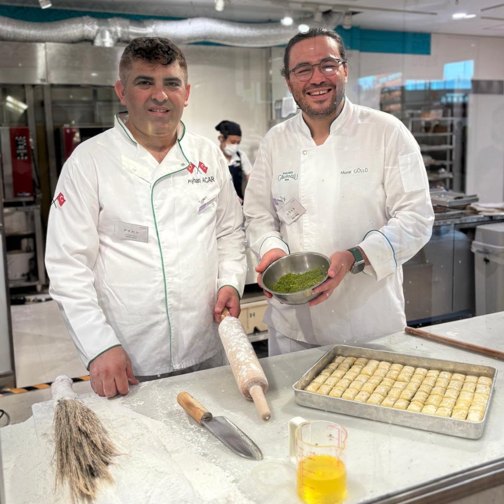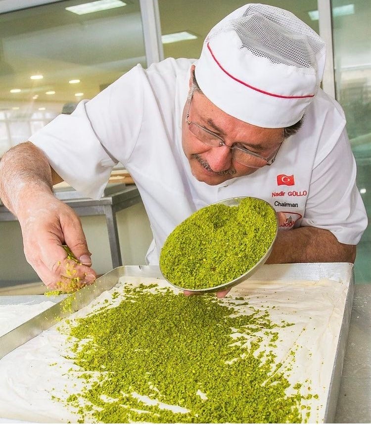 手作業によって何十層にも重ねられたバクラヴァのパイ生地は、経験を積んだ職人によって成しえる技術の結晶です。またバクラヴァは工程ごと(生地作り、生地の重ね合わせ、焼成、シロップ作りなど)に熟練職人がおり、分業しているため、一人でバクラヴァを作り上げることはなく、何人もの職人の手で一つ一つのバクラヴァができています。