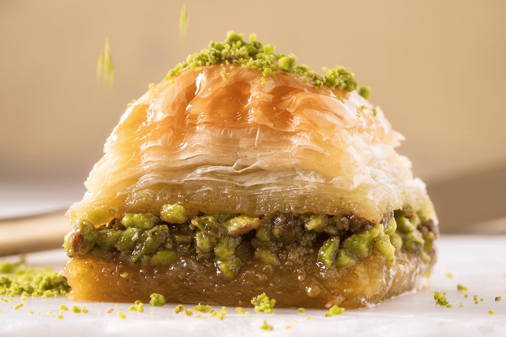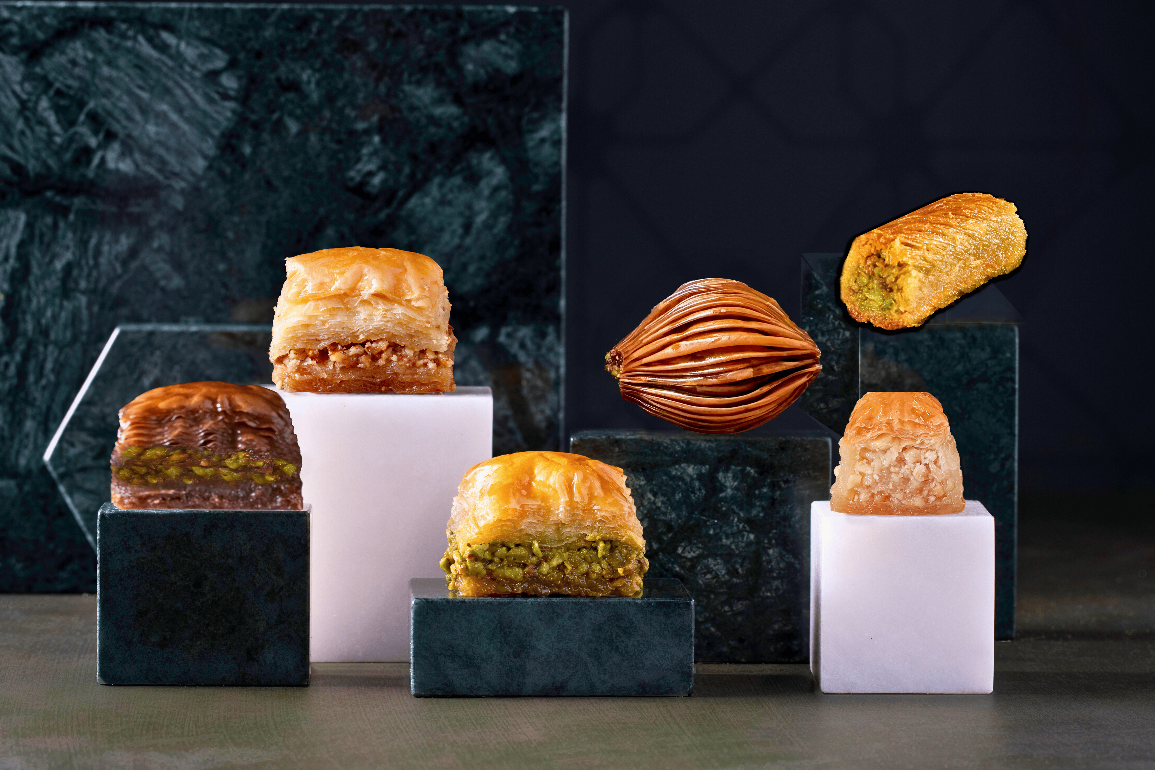 パイ生地にピスタチオやくるみ、ヘーゼルナッツなどの砕いたナッツを挟み焼き上げ、バターシロップをかけ仕上げるトルコの伝統焼菓子。