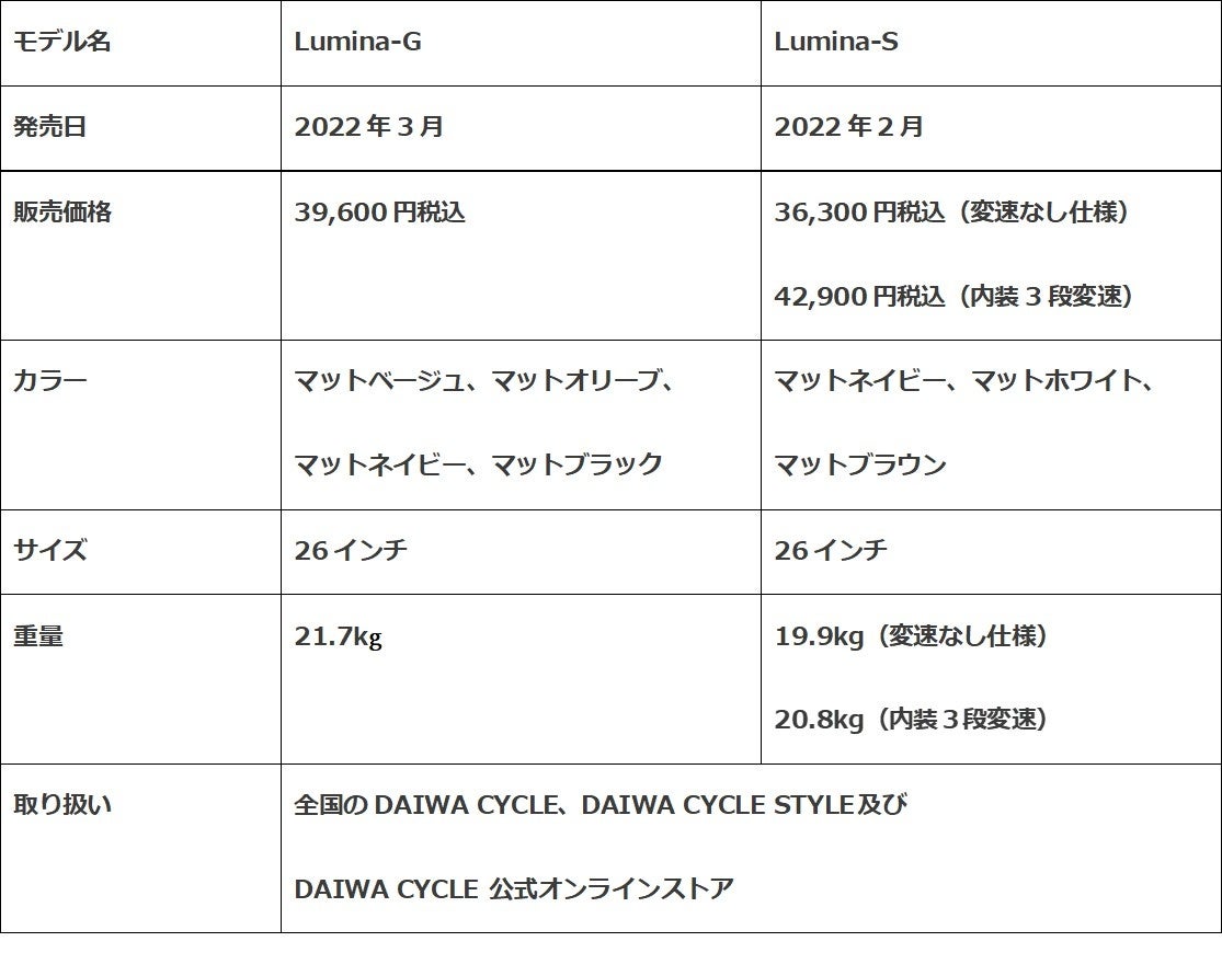 自転車の「新しいアタリマエ」を創る自転車専門店、DAIWA CYCLE株式会社(所在地:大阪府吹田市、代表取締役:涌本宜央)は、明るいライトで被視認性を高めて事故を防ぐ通勤・通学用自転車、Lumina(ルミナ)シリーズ 2車種を全国のDAIWA CYCLEおよびオンラインストアで発売します。