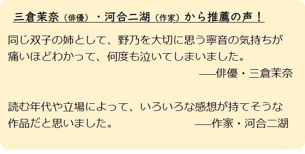 主人公・寧音の双子の妹である野乃の喪失を描きながらも、最後はハッピーエンドへ。読み終えたなら幸福感に包まれることでしょう。