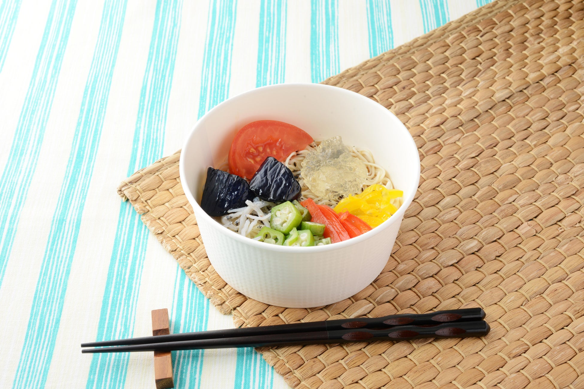 揚げナスやオクラといった季節の野菜としらすをメインに味わう和えそうめんです。