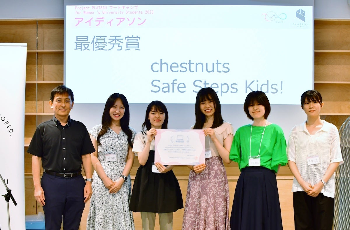 3名の審査員による採点により、「通学路を疑似体験することで、楽しく交通安全を学ぶサービス」を発表した日本女子大学の有志チーム「chestnuts」が最優秀賞を、参加学生からの投票により「地形データを活用したウォーキング・ランニングコース提案アプリ」を発表した大妻女子大学の有志チーム「おーたんズ」がオーディエンス賞をそれぞれ受賞しました。また、審査員特別賞を、複数大学混成チーム「天然水」と日本女子大学の「カラフル」が受賞しました。