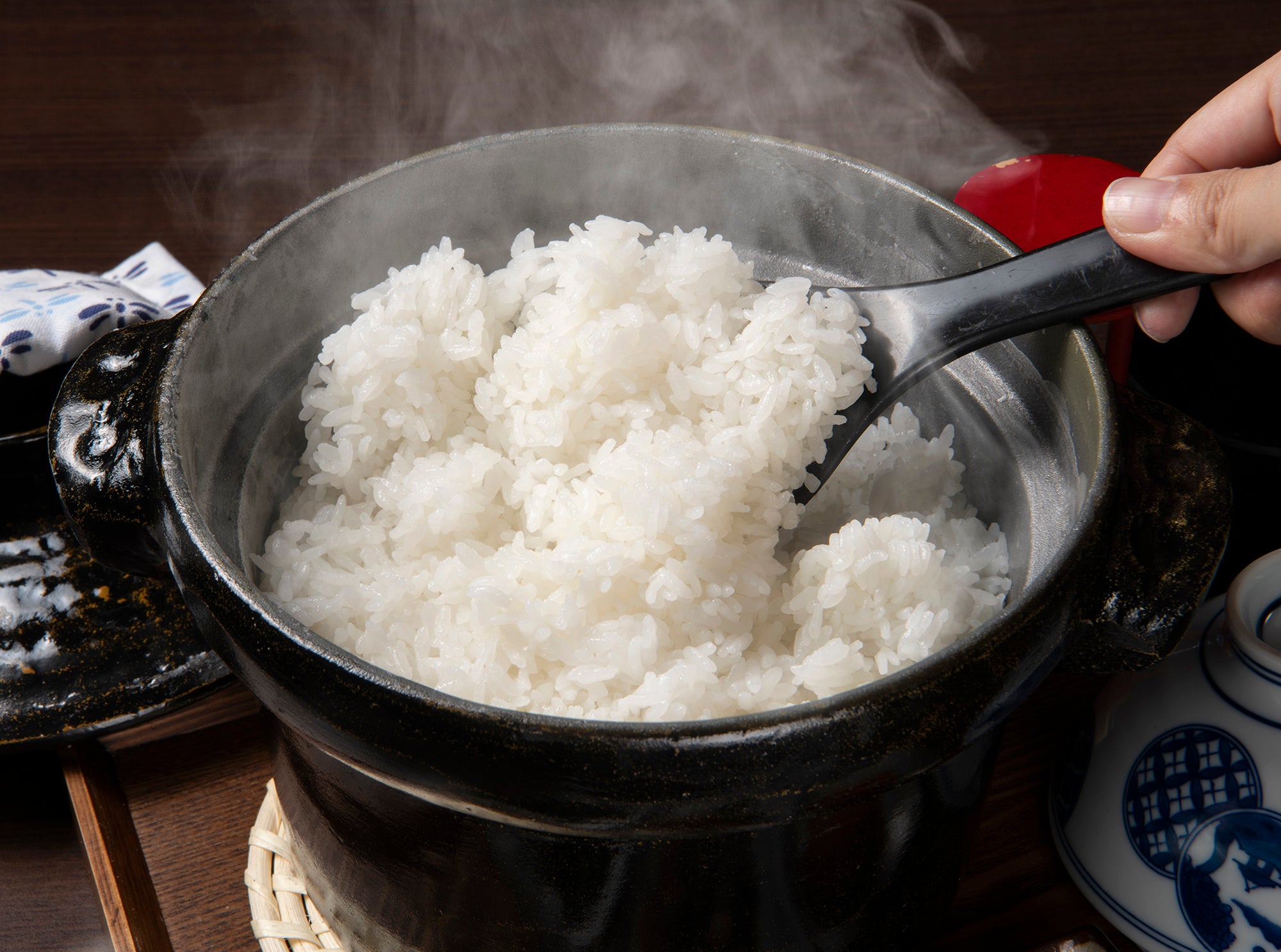 店内毎日精米!炊き⽴て土鍋ご飯 1合 590円(税込649円)