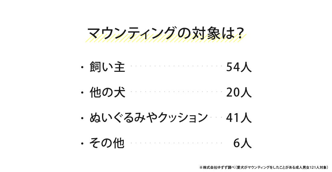 続いて「マウンティングの対象は?」と聞いてみたところ、最も多かった回答が「飼い主(54人)」でした。