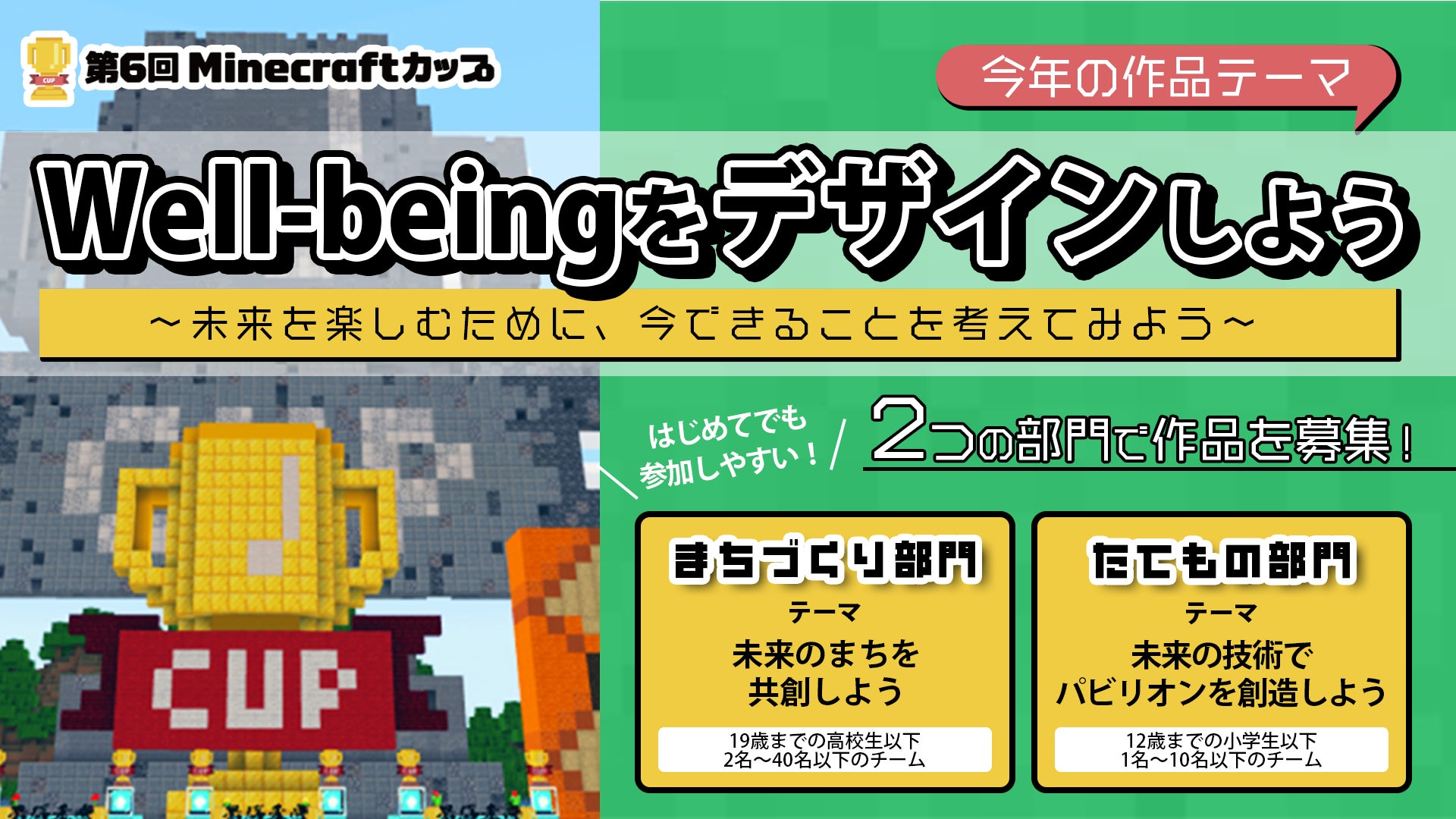 第6回Minecraft カップでは「17のSDGs目標が達成された後の未来」を描く人材を育てることを目的に「Well-being をデザインしよう」を大きなテーマとして扱います。