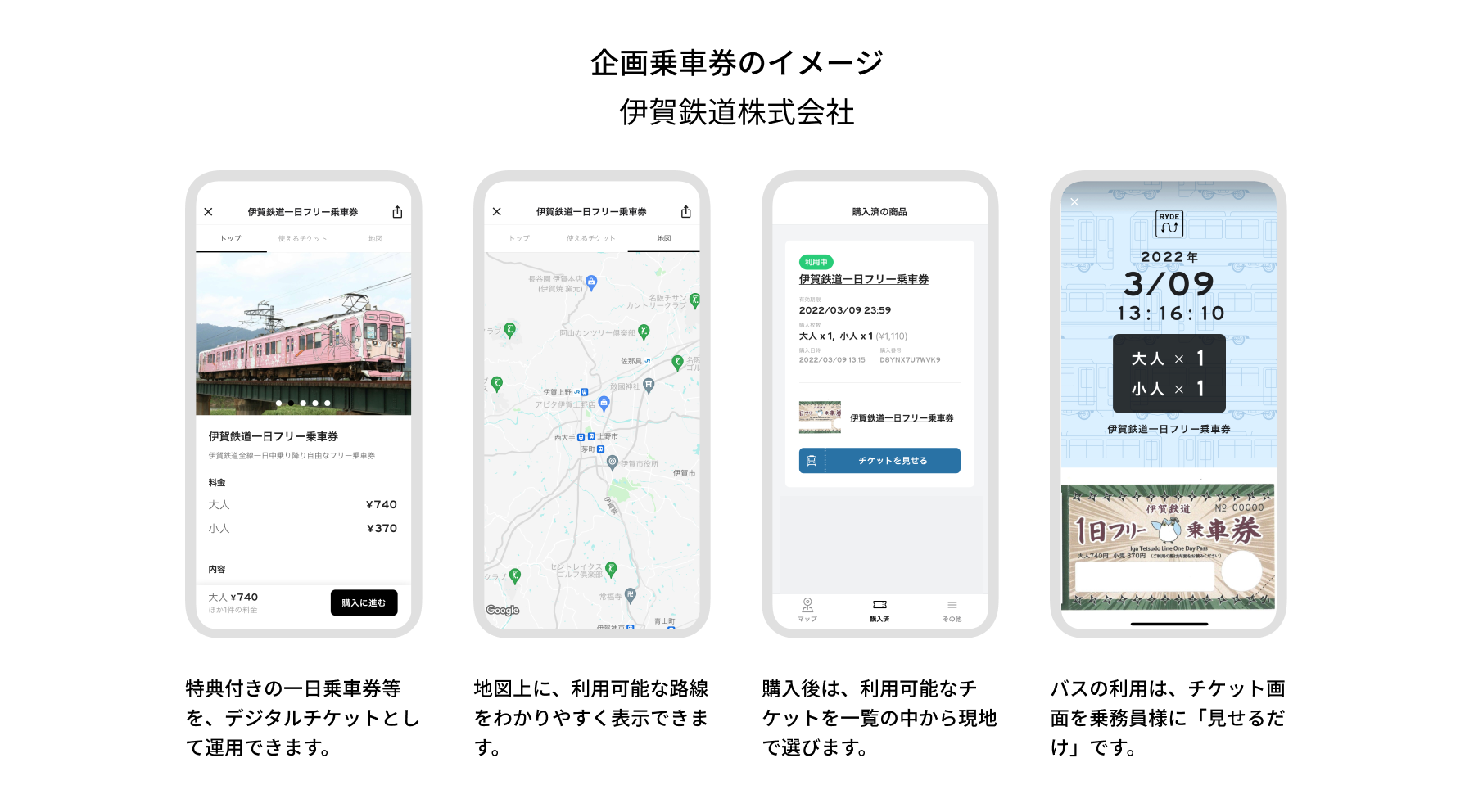 二次交通のDXを推進するRYDE株式会社(本社:東京都渋谷区、代表取締役 杉崎正哉、以下「RYDE」)と伊賀鉄道株式会社(本社:三重県伊賀市、代表取締役社長:安東隆昭)は提携を開始しました。提携に伴い、同社初のデジタル乗車券「伊賀鉄道一日フリー乗車券」をはじめとする、お得な乗車券3種を3月25日(金)から販売開始します。モビリティプラットフォーム「RYDE PASS」の導入によって、伊賀鉄道内で一日乗り放題の乗車券で自由に1日乗降車が可能な乗車券のデジタル化・キャッシュレス化が、導入コストをかけずスムーズに実現しました。さらに、窓口や車内改札業務の効率化を推進するほか、新規の観光客の誘致を行うことで地域経済の活性化に繋げてまいります。