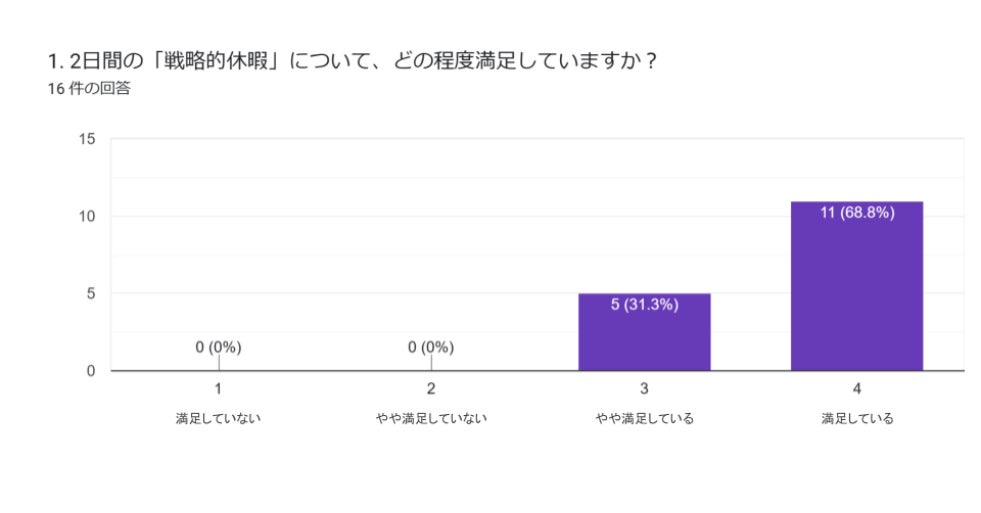 戦略的休暇についての社員満足度アンケートでは、「2日間の戦略的休暇について、どの程度満足していますか?」という質問に対して、「4.満足している」の回答者が68.8%、「3.やや満足している」の回答者が31.3%となり、全員が「満足している」という結果になりました。