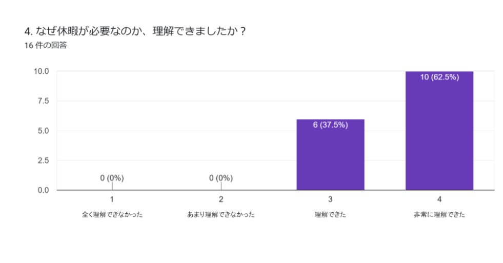 また、「なぜ休暇が必要なのか、理解できましたか?」という質問に対しては、「4.非常に理解できた」の回答者が62.5%、「3.理解できた」の回答者が37.5%となり、こちらも全員が「理解できた」という結果になりました。