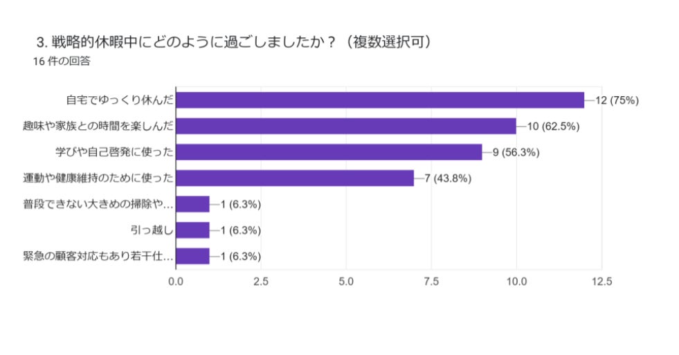 「戦略的休暇中にどのように過ごしましたか(複数選択可)」という質問に対しては、「自宅でゆっくり休んだ」が75%、「趣味や家族との時間を楽しんだ」が62.5%、「学びや自己啓発に使った」が58.3%、「運動や健康維持のために使った」が43.8%という結果となり、心身をリフレッシュする形で過ごしたという意見が多かったです。