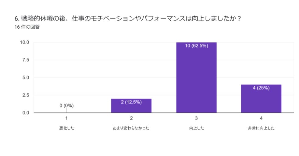 「戦略的休暇の後、仕事のモチベーションやパフォーマンスは向上しましたか?」という質問に対しては、「3.向上した」が最も多い62.5%という結果となり、次いで「4.非常に向上した」が25%、「2.あまり変わらなかった」が12.5%で、モチベーションやパフォーマンスの向上を感じられた社員が8割を超える結果となりました。