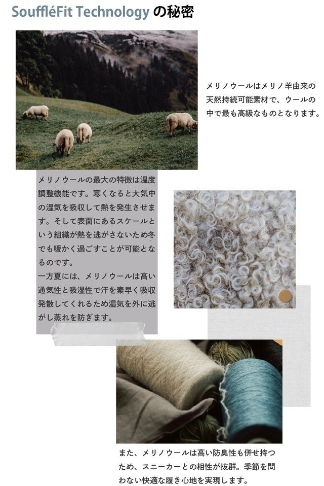 Souffle FitTechnology™と呼ばれるこの裏地は、高い吸水性と保温性、防臭性を備えており、夏は涼しく、冬は暖かく足を保つことができます。