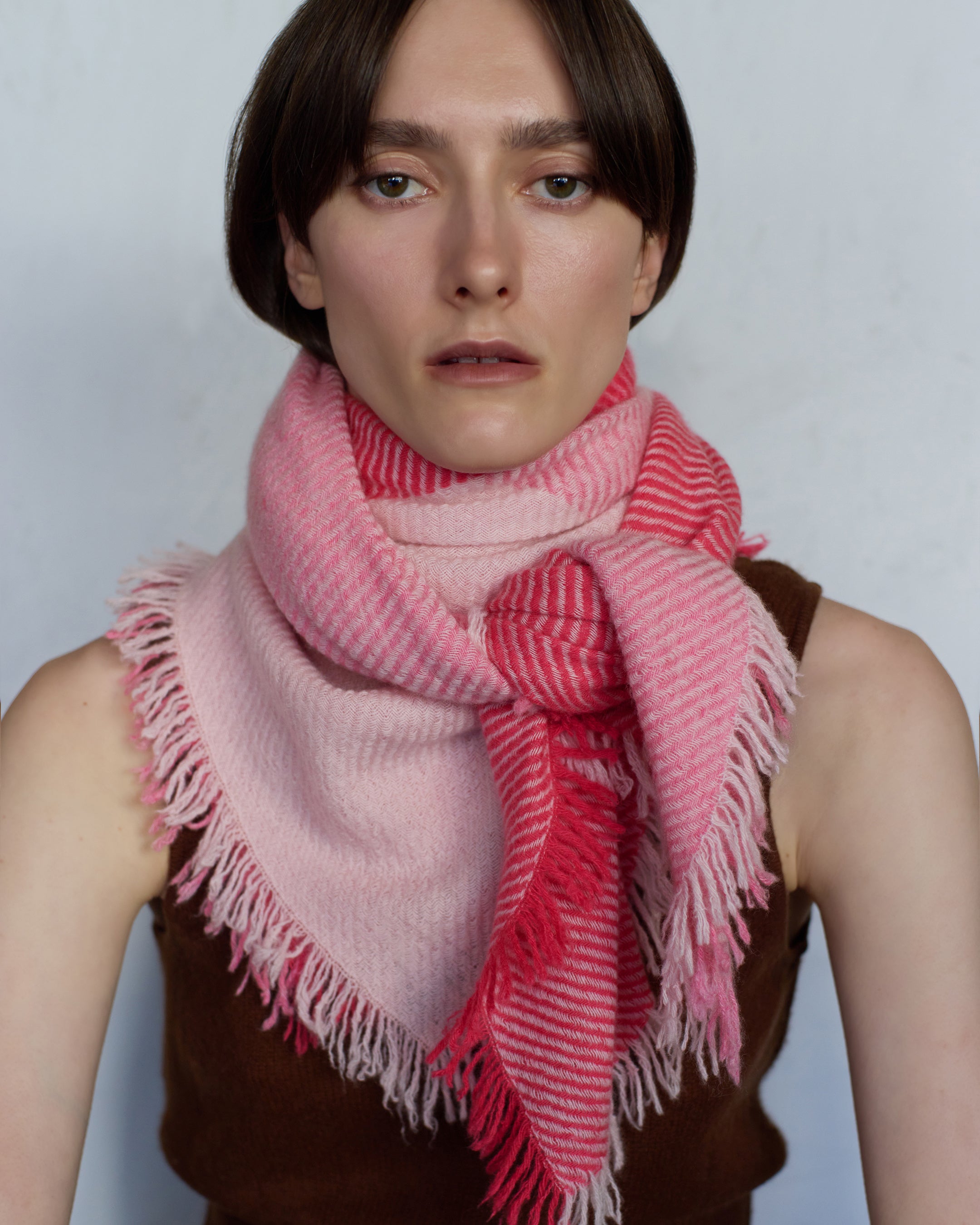 elegancese(エレガンセーゼ) の25aw Collectionでは、美術家ヨゼフ・アルバースからインスピレーションを受けた色鮮やかで吸い込まれるような色彩を、上質で豊かな表情を持つカシミヤで表現しています。原料そのものが放つ澄んだ発色と、表面に浮かぶやわらかな波紋が、カシミヤという素材の本質をより一層際立たせます。