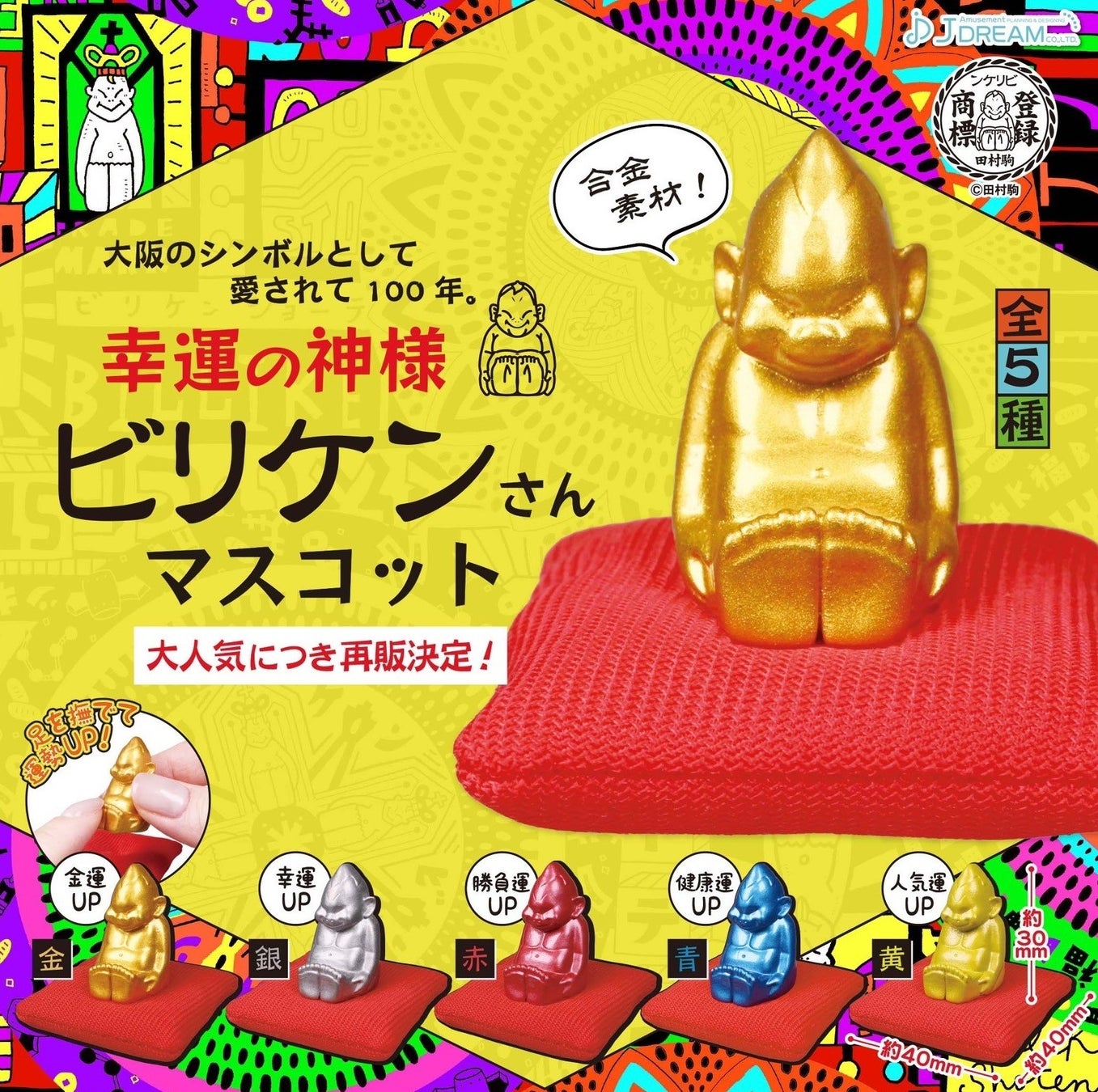 ビリケンさんのライセンスを展開する田村駒株式会社(本社:大阪府大阪市、代表取締役社長:堀 清人)と株式会社Jドリーム(所在地:大阪府大阪市、代表取締役社長:谷浦 彰俊)は、大阪でのシンボルとして親しまれている「ビリケンさん」のミニチュアマスコットを再販することを発表します。関西を中心に全国のカプセルトイ専門店、駅ナカ、スーパーなどにて、2024年12月より順次展開を開始します。