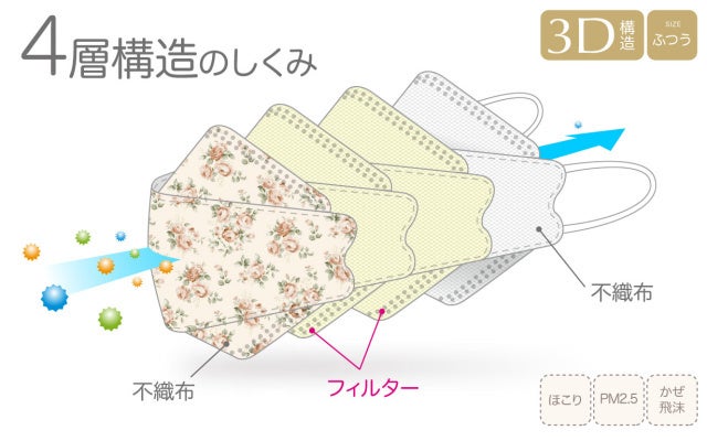 布マスクや一般的な不織布マスクよりも飛沫をカットする4層構造のフィルターは、PFE99%(ほこり、PM2.5など)、VFE99%(ウイルス飛沫)、BFE99%(バクテリア(細菌)の捕集効果があり、0.1μmサイズの微粒子を捕集することができます。可愛いだけでなく、品質にももちろんこだわった3D フローラルマスクです。