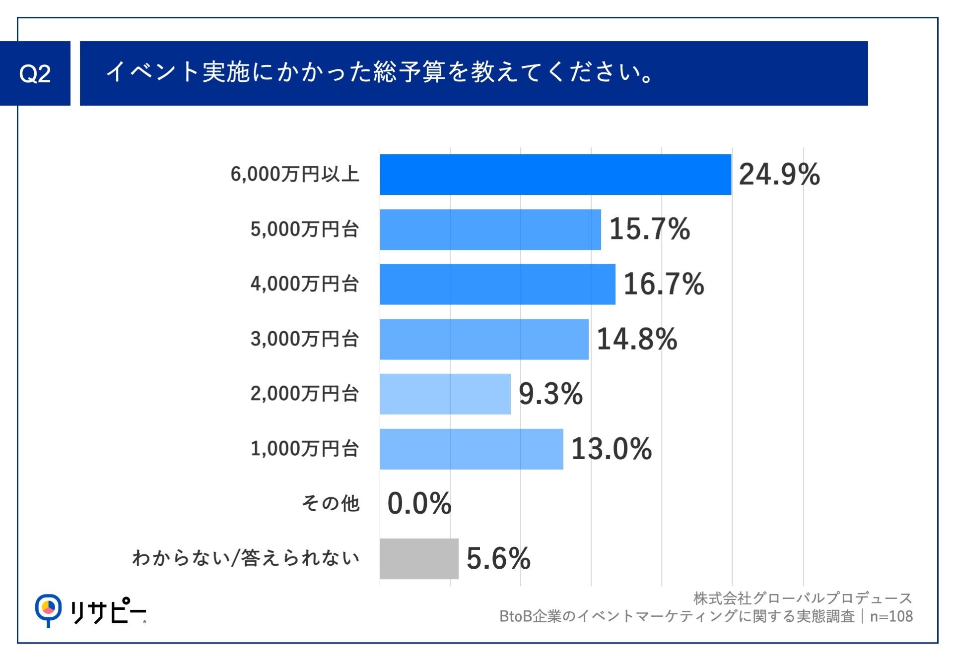 「Q2.イベント実施にかかった総予算を教えてください。」(n=108)と質問したところ、「6,000万円以上」が24.9%、「4,000万円台」が16.7%、「5,000万円台」が15.7%という回答となりました。