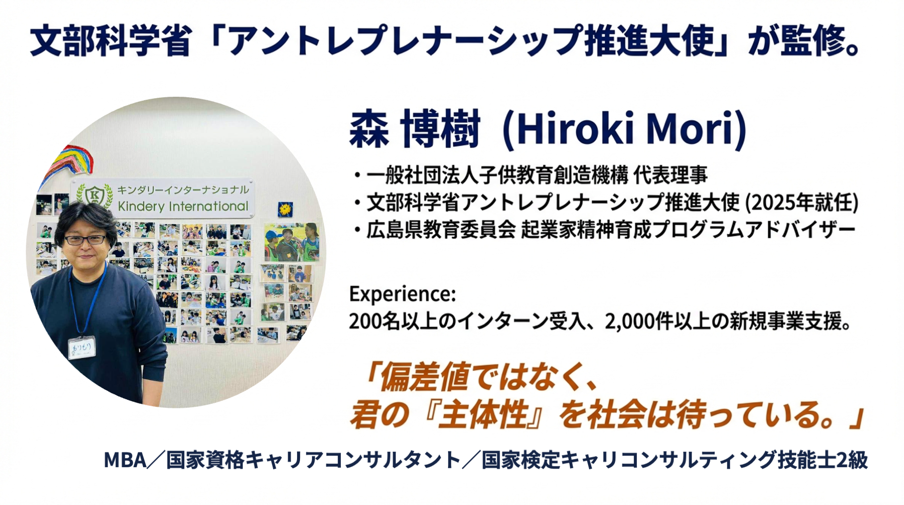 国家資格キャリアコンサルタント/キャリアコンサルティング技能士2級、Gallup認定ストレングスコーチ。全国の自治体や教育委員会で起業家教育プログラムのアドバイザーを務めるなど、幅広い育成活動を展開。