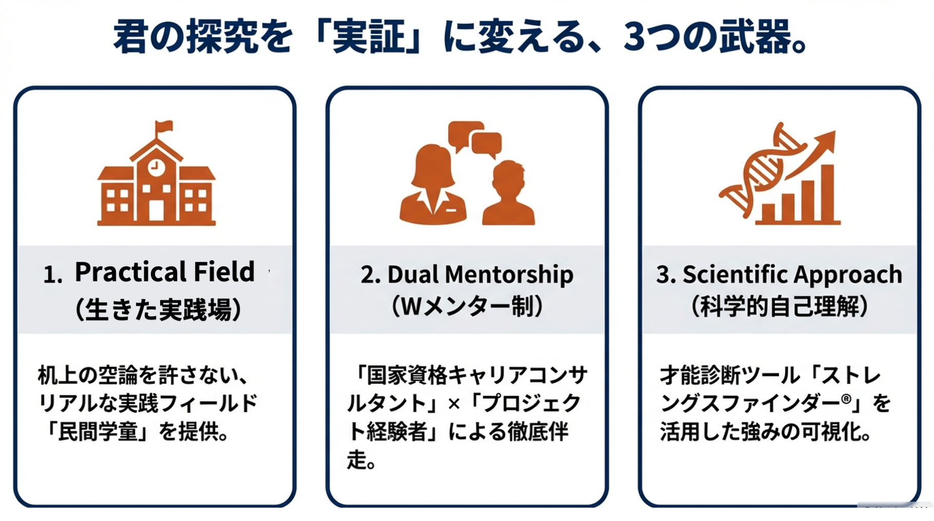 探究活動に行き詰まりはつきものです。本プログラムでは、国家資格キャリアコンサルタントと、総合型選抜や探究学習を乗り越えた先輩陣による「Wメンター制」を採用。週1回の個別作戦会議を通じて参加メンバーの思考を整理し、プロジェクトを確実に前進させます。