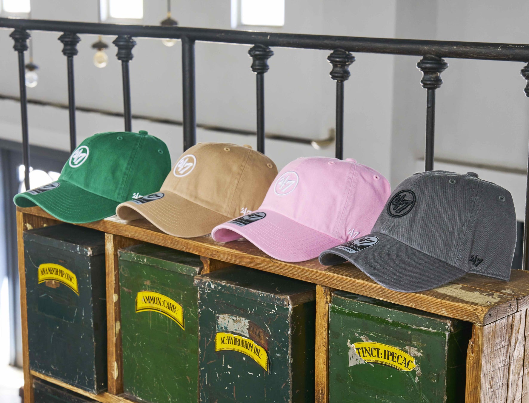 ’47 のブランドロゴが正面に刺繍された限定の’47 CLEAN UP。今までも店舗オープンのリミテッドとして販売しており、通常は販売していない貴重なキャップです。ハラカドのオープンに合わせて、ハラカドをイメージした新色カラー(ケリー、カーキ、ペタルピンク、チャコール)の4種が数量限定で登場します。