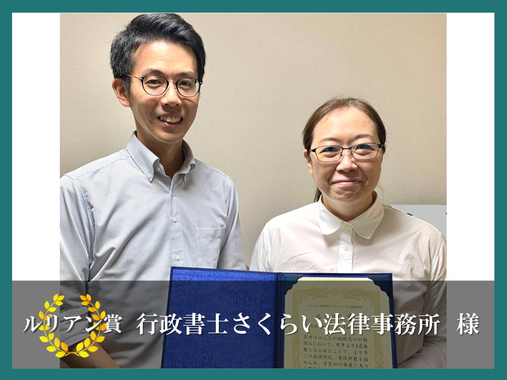 2024年相続⼿続き分野で最も活躍した専⾨家・団体に贈られる「みんなの相続窓⼝アウォーズ」は、2023年9⽉1⽇から2024年8⽉31⽇のデータを基に総合的に判断し、お客様からの評価が⾼かったと思われる事務所を「最優秀賞」(団体が対象)とし、特別賞して「ルリアン賞」(団体または個⼈)、さらには新⼈賞(団体または個⼈)の3つの賞に選定されました。株式会社ルリアン創業以来、他を圧倒する実績で”殿堂入り”となっている行政書士法人F&Partners(京都)、同F&Partners East(東京)、同ライフ(広島)の3法人を除いた全国のパートナー事業者を対象に選定が⾏われました。