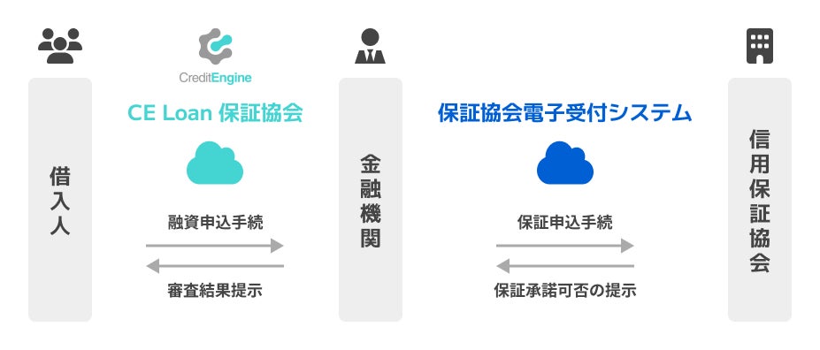 「信用保証協会電子受付システム」とは、全国51の信用保証協会が信用保証申込手続きの電子化を進めるため、全国信用保証協会連合会が事務局となり構築されたシステムです。信用保証申込手続きの電子化・効率化により融資実行までのリードタイムの短縮や非対面での手続きが可能となります。なお、「信用保証協会電子受付システム」には、クレジットエンジンの「CE Online Lending Platform」が実装されています。