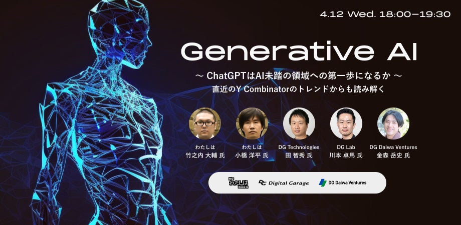 このたび世界的な生成AI領域の盛り上がりを受けて、DGDVの投資先で、数年前からGPTをB2B向けにカスタマイズしながら生成AIのビジネス化を目指し、大喜利AIの開発も行う株式会社わたしは(以下:わたしは)のCEO竹之内大輔氏、CTO小橋洋平氏、そして株式会社デジタルガレージ(以下:デジタルガレージ)においてAI関連の事業開発を担当する田智秀氏、川本卓馬氏を招いてウェビナーを開催しました。