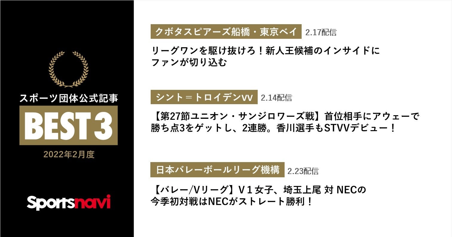 クボタスピアーズ船橋・東京ベイ、シント=トロイデンVV、日本バレーボールリーグ機構が受賞! スポーツ団体公式記事月間ベスト3(22年2月度)