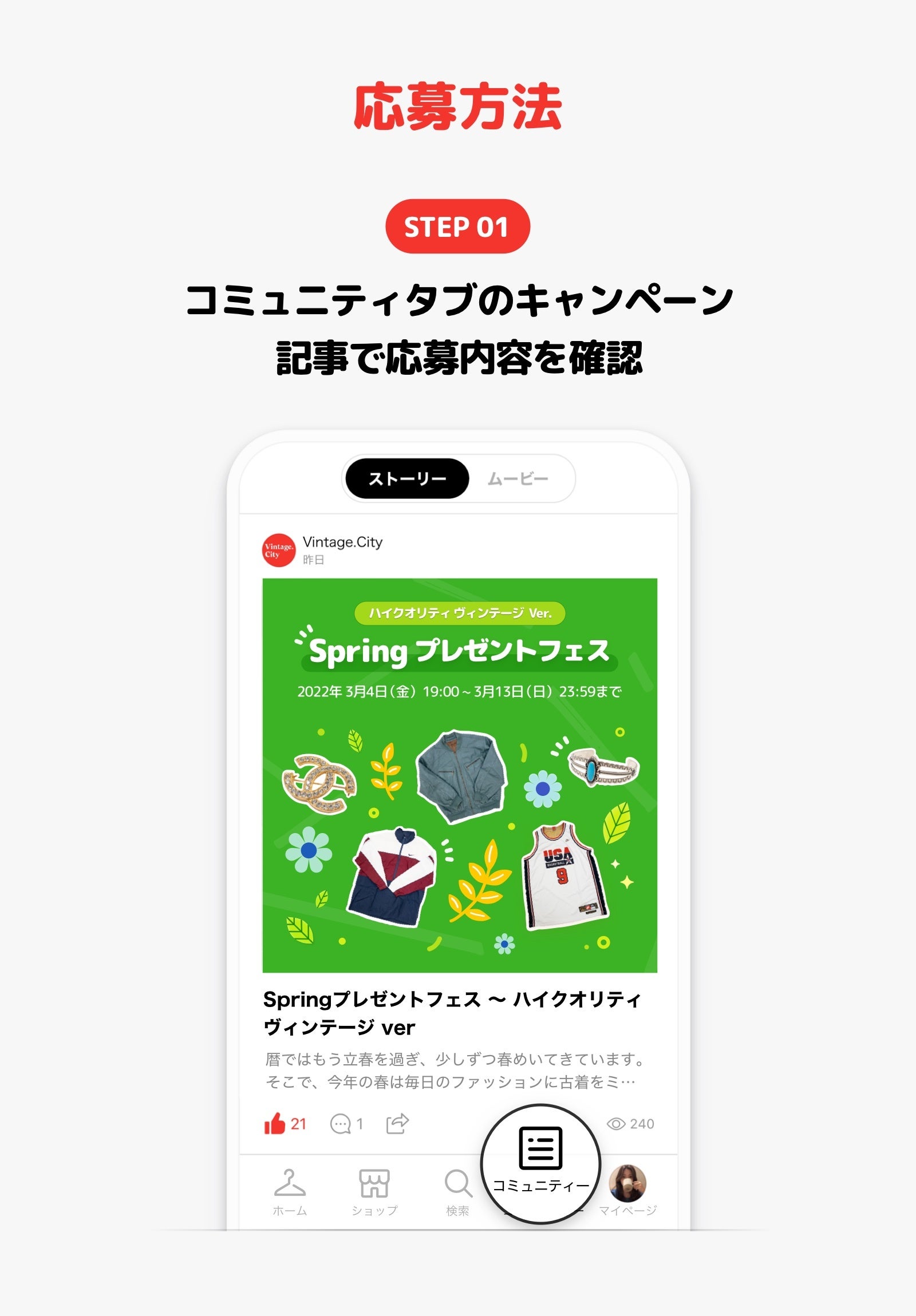 2022年3月4日(金)19:00に「Vintage.City」のアプリ内にある「コミュニティ」ページの応募要項を確認
