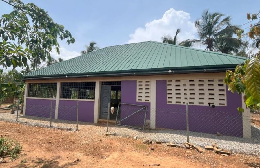 ガーナ共和国のカカオの生産が盛んな村に、主食であるキャッサバ(イモ類の一種)を加工し付加価値を高めるための加工所を建設しました。村の中心に土の道が走り、木骨土壁・トタン屋根の家屋が並ぶなか、鮮やかな紫色の外壁が目を引くこの建物は、コミュニティの新たな拠点となっています。