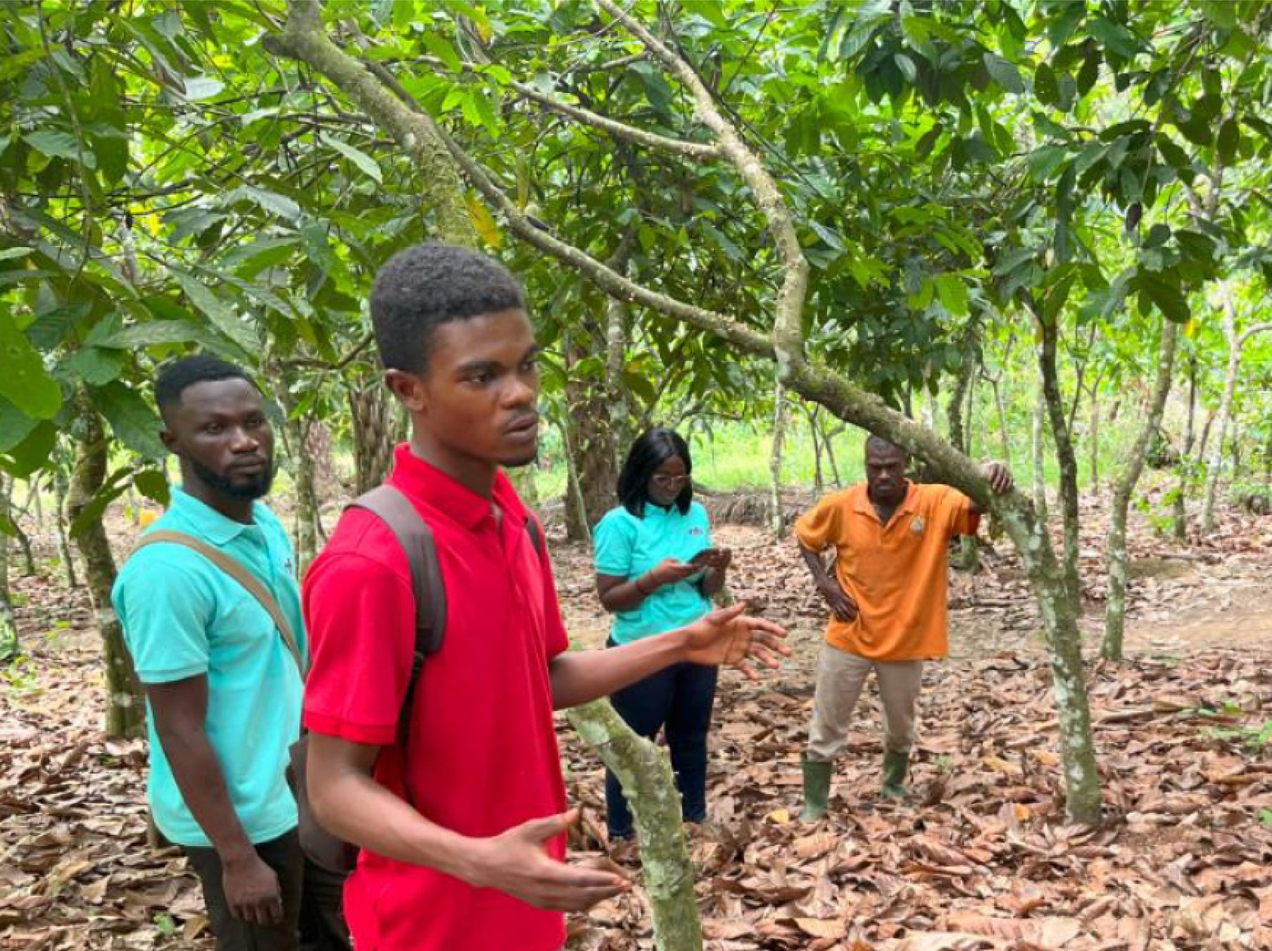 現地視察では、現地の営農指導者のもと剪定や環境整備を丁寧に実践している農家の様子を確認しました。今回視察したモデル農園を手がける37歳の農家は、20年近いカカオ栽培の経験を持ち、ガーナ平均(約1ヘクタール)の6倍近い農地を管理しています。日陰樹による適切な日照管理と風通しの確保が、ブラックポッド(カビ)などの病害抑制にも効果をもたらしていました。