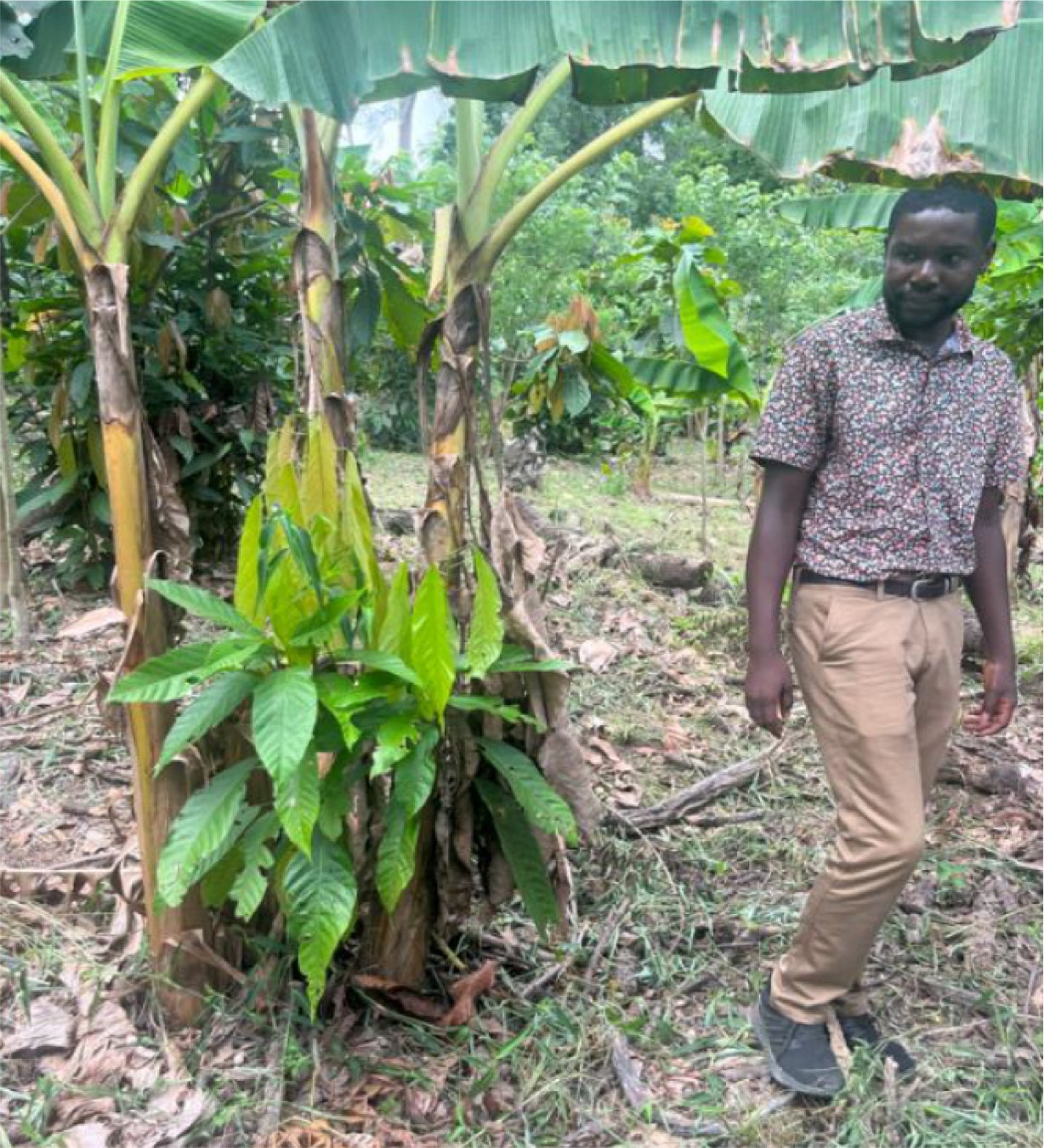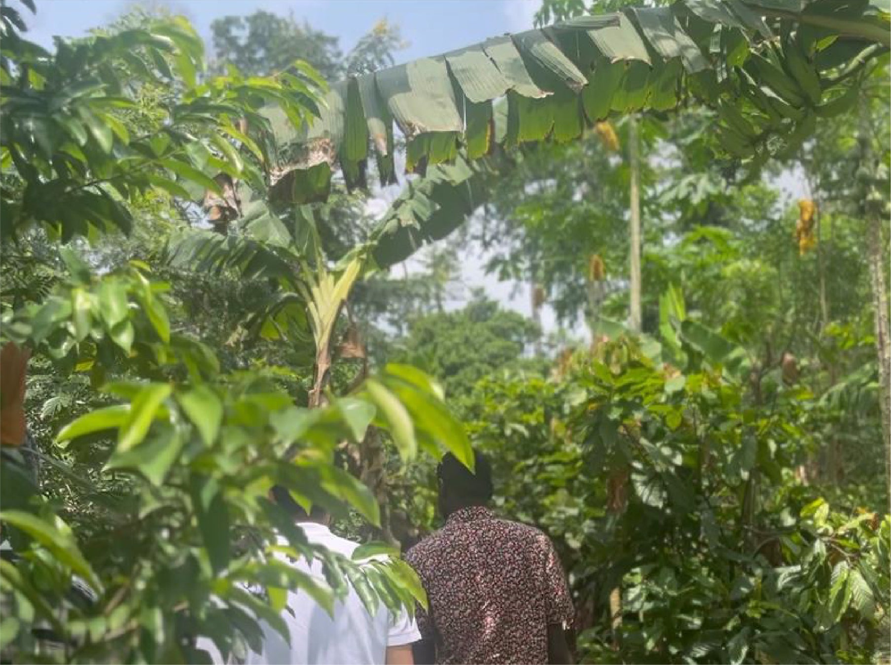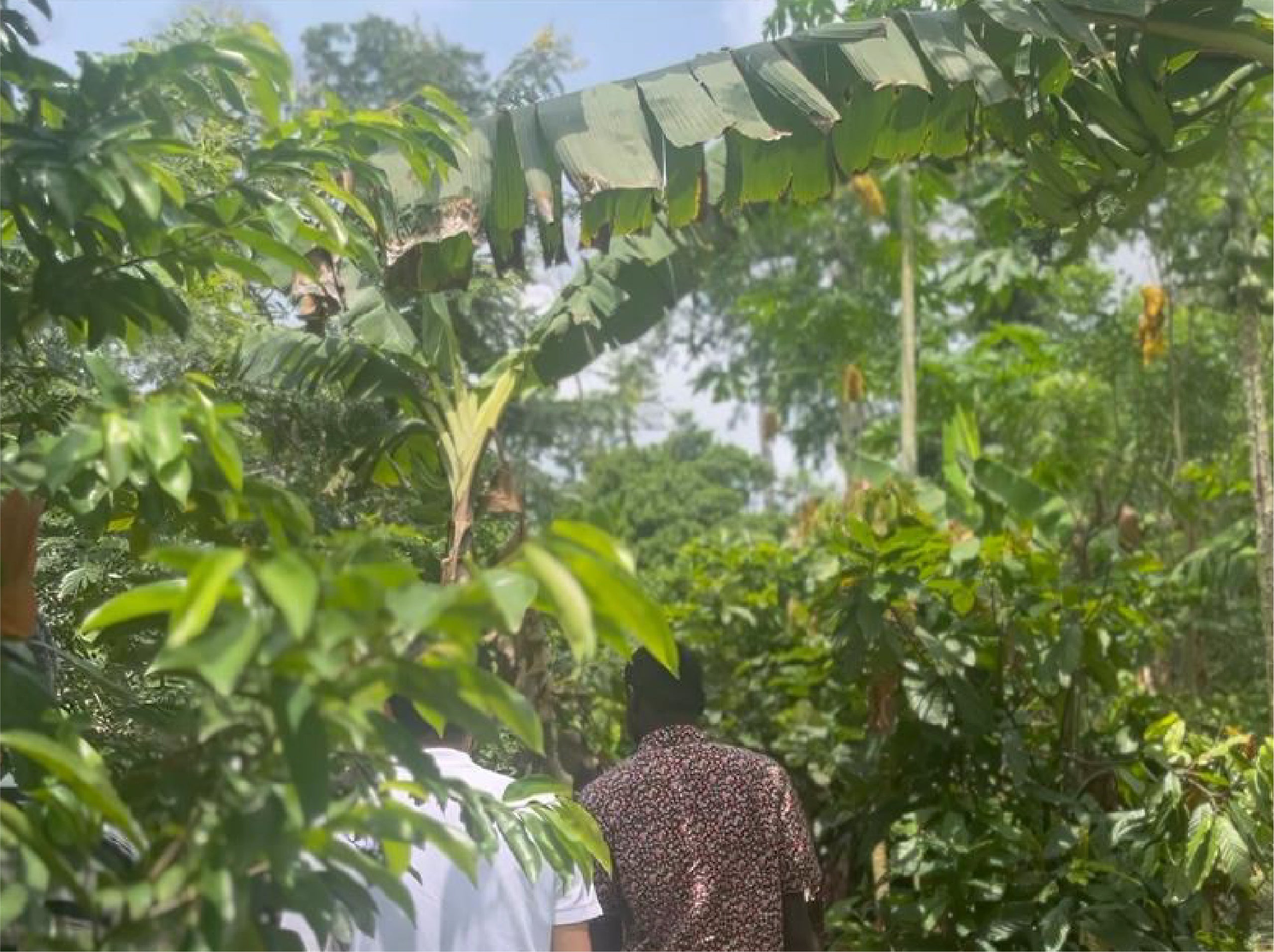 アグロフォレストリーとは、カカオの木とともに成長の早い樹木やバナナなど複数の作物を組み合わせて栽培する農業手法です。カカオ収穫まで4〜5年かかる期間でも別の作物から収入を得られるほか、森林の生態系を守りながら農家の収入安定化にも貢献します。