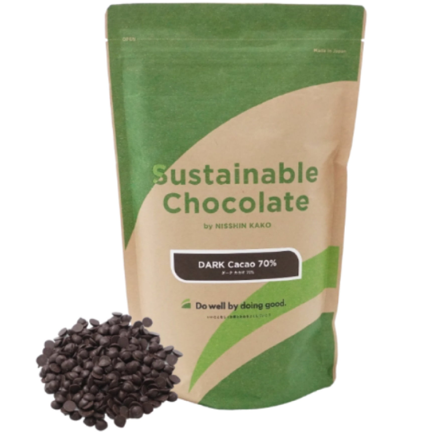 日新化工の「サステナブルチョコレートシリーズ」は、農家支援・児童労働撲滅・森林保全の取り組みのもとで栽培されたガーナ産カカオ豆を使用した業務用チョコレートです。このシリーズの売上の一部が「Do well by doing good.」プログラムの活動資金として産地に還元されます。チョコレートを購入・消費する方々の「おいしい」が、ガーナのカカオ農家の「うれしい」に直接つながる仕組みです。