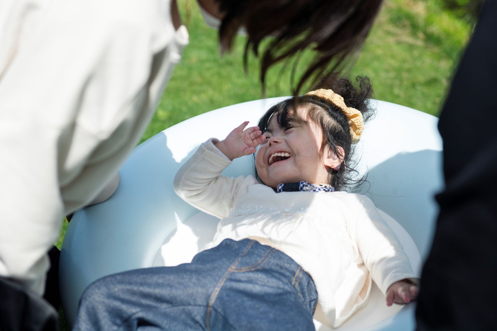 医療的ケア児の現状として「3歳の子どもなのに友だちと一度も遊んだことがない」「遊ぶ機会が無く笑顔が少ない、ケアする人につくり笑顔をする」などあそびから遠いことをきっかけにつながりや感情の豊かさが乏しくなってしまうという課題がありました。医療的ケア児は全国で約2万人いるとされ、外出や旅行ができている家族は17.2%にとどまっています(厚生労働省調査)。私たちは、遊具側から自分らしく遊べることや分けなくていいことの主張を試みました。家と病院の往復から地域の遊び場に出るきっかけを作ったり、友だちと一緒に遊ぶための媒介になったりするような遊具の在り方を目指し、様々な個性を持つ子どもたちと一緒に遊具の開発を行うことであそび場の境界を溶かしたいと考えました。