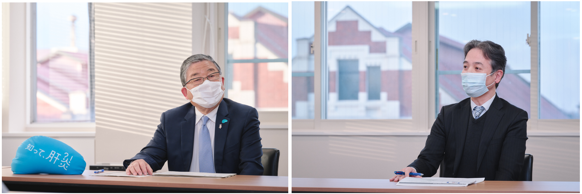 株式会社モリタ製作所を訪問した徳光氏は、株式会社モリタ製作所 代表取締役社長の田中 博氏、そして取締役の阪野 悦生氏と面会し、肝炎対策をテーマに対談を行いました。対談には、京都府立医科大学大学院医学研究科の山口寛二先生にもご参加いただきました。