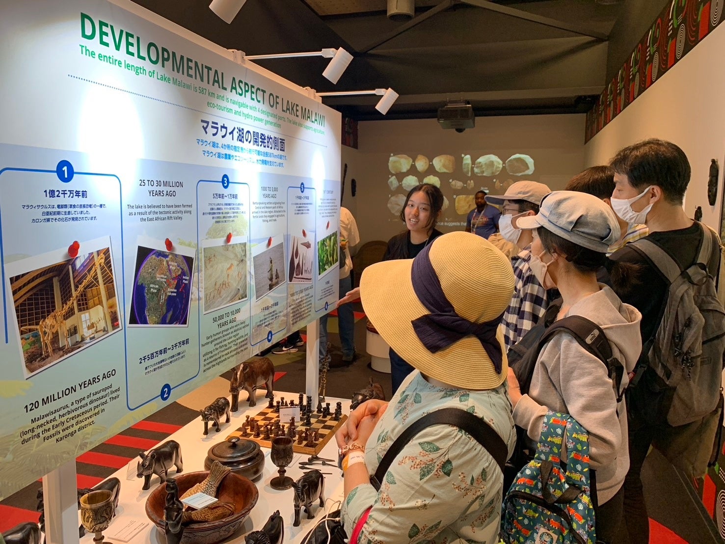 マラウイブースでは、マラウイの歴史や自然を紹介し、伝統工芸品のエボニー彫刻、特産品のコーヒーを展示しています。せいぼスタッフは、来場者に展示物の説明を行いました。