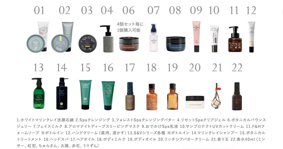 ・対象商品: ホワイトマリンクレイ洗顔石鹸、Spaクレンジング、フォレストSpaクレンジングバター、リセットSpaクリアジェル、ボタニカルバウンスジェリー、フェイスミルク、アロマナイトディープスリーピングマスク、おでかけSpa乳液、サンプロテクトUVカットクリーム、F&Hフォームソープ※ボトルイン、ハンドクリーム(薬用、酒かす)、S&Vシリーズ各種※ボトルイン、マリンクレイシャンプー、ボタニカルトリートメント、ヘッドスパ、ヘアオイル、ボディミルク、ボディオイル、リッチシアバタークリーム、香り玉、香水40ml(ミンサー、紅型、ちゅらさん、太陽、赤花、うりずん)