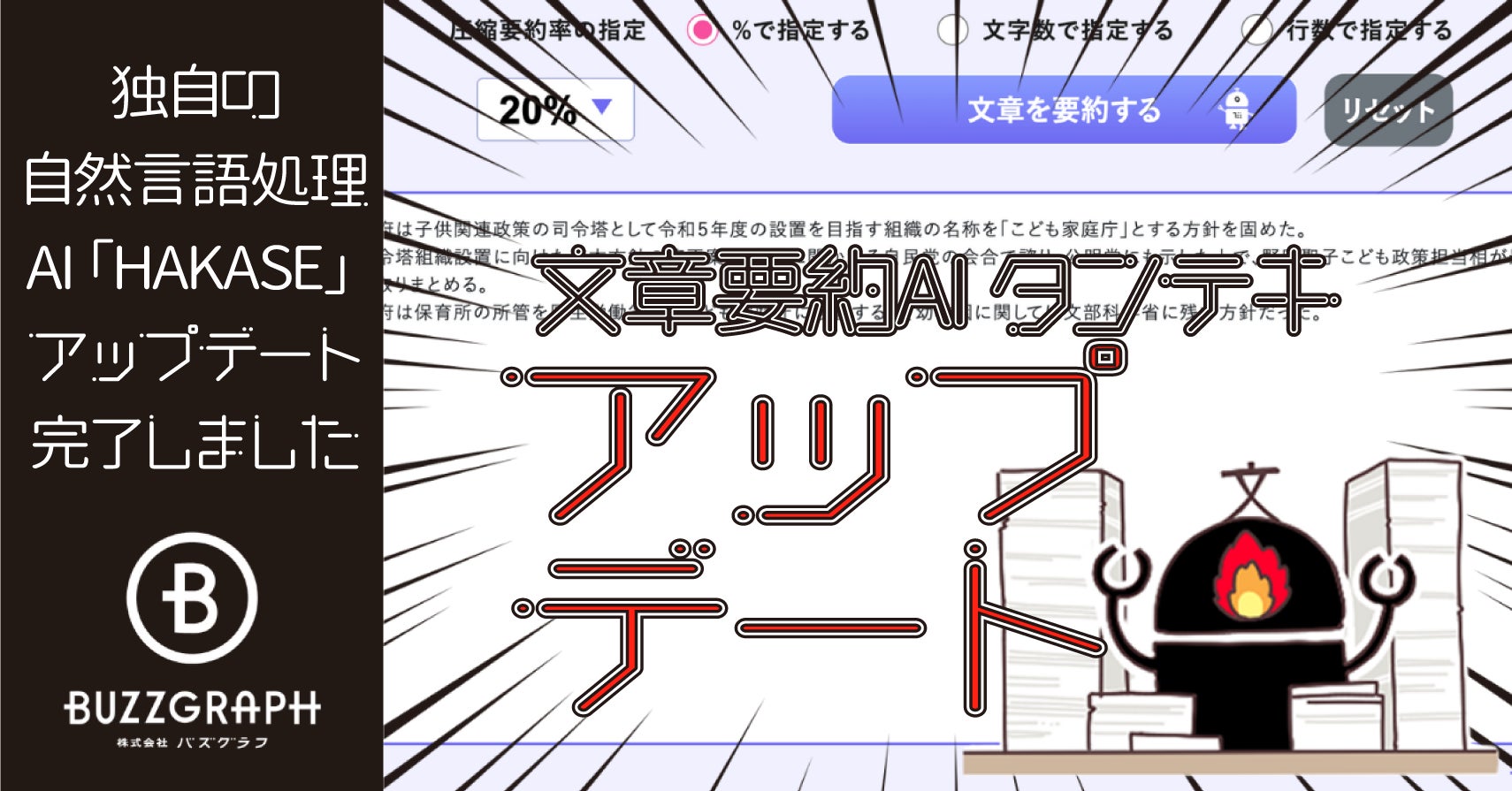 株式会社バズグラフ(本社:福岡県福岡市博多区博多駅東、代表取締役:西本光治)は、独自の自然言語処理AI『HAKASE』が搭載されているサービスである「文章要約AI タンテキ」をはじめとした自社開発の要約サービスの精度向上のため、5月30日(月)に『HAKASE』のアップデートを行ったことをお知らせいたします。