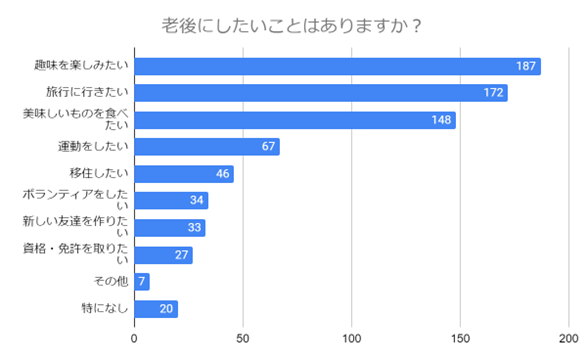 「老後にしたいことはありますか」の設問で多かった回答は「趣味を楽しみたい」「旅行に行きたい」「美味しいものを食べたい」の3つに分かれました。