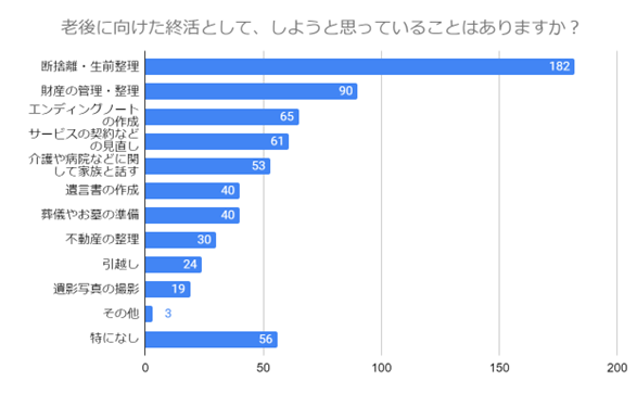 「老後に向けた終活として、しようと思っていることはありますか?」の設問では、「断捨離・生前整理」「財産の管理・整理」「エンディングノートの作成」の順に多く選ばれました。