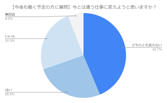 今後も働く予定の方に「今とは違う仕事に変えようと思っているか」を伺ったところ、約4割の方が「どちらとも言えない」と回答し、「はい」と「いいえ」はほぼ同数の結果となりました。