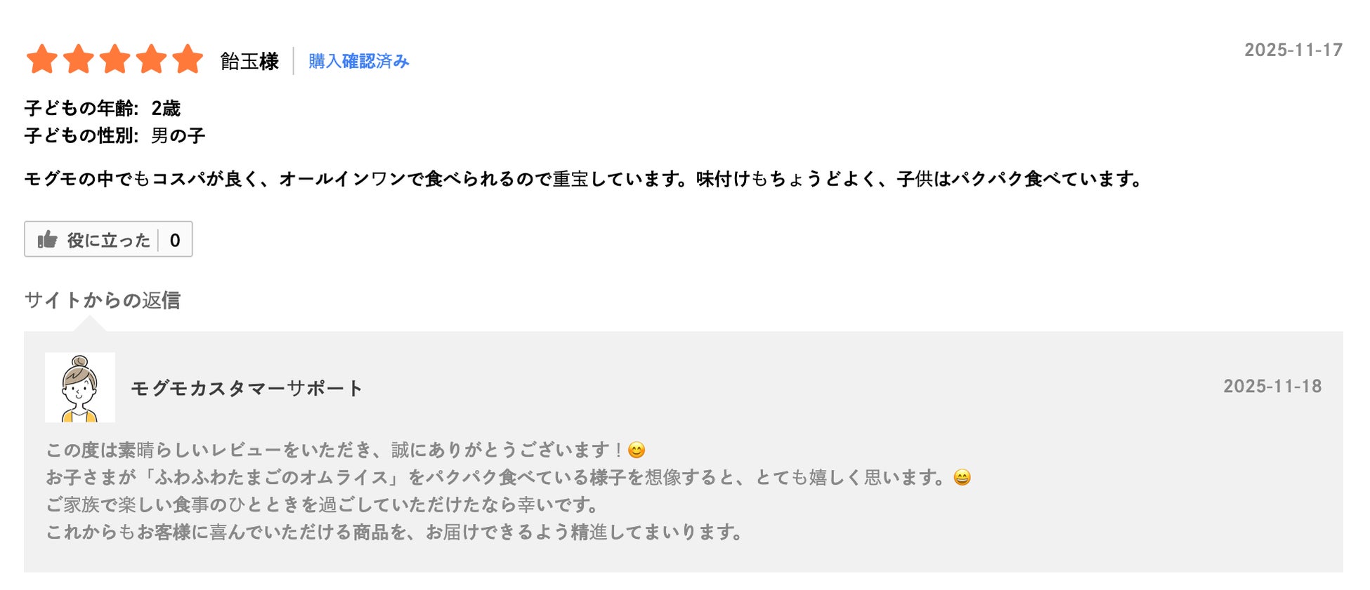「あっという間に完食して驚いています。チキンライスは食べムラがあるので心配でしたが、よく食べてくれて、頼んでよかったです。またお願いしようと思います」