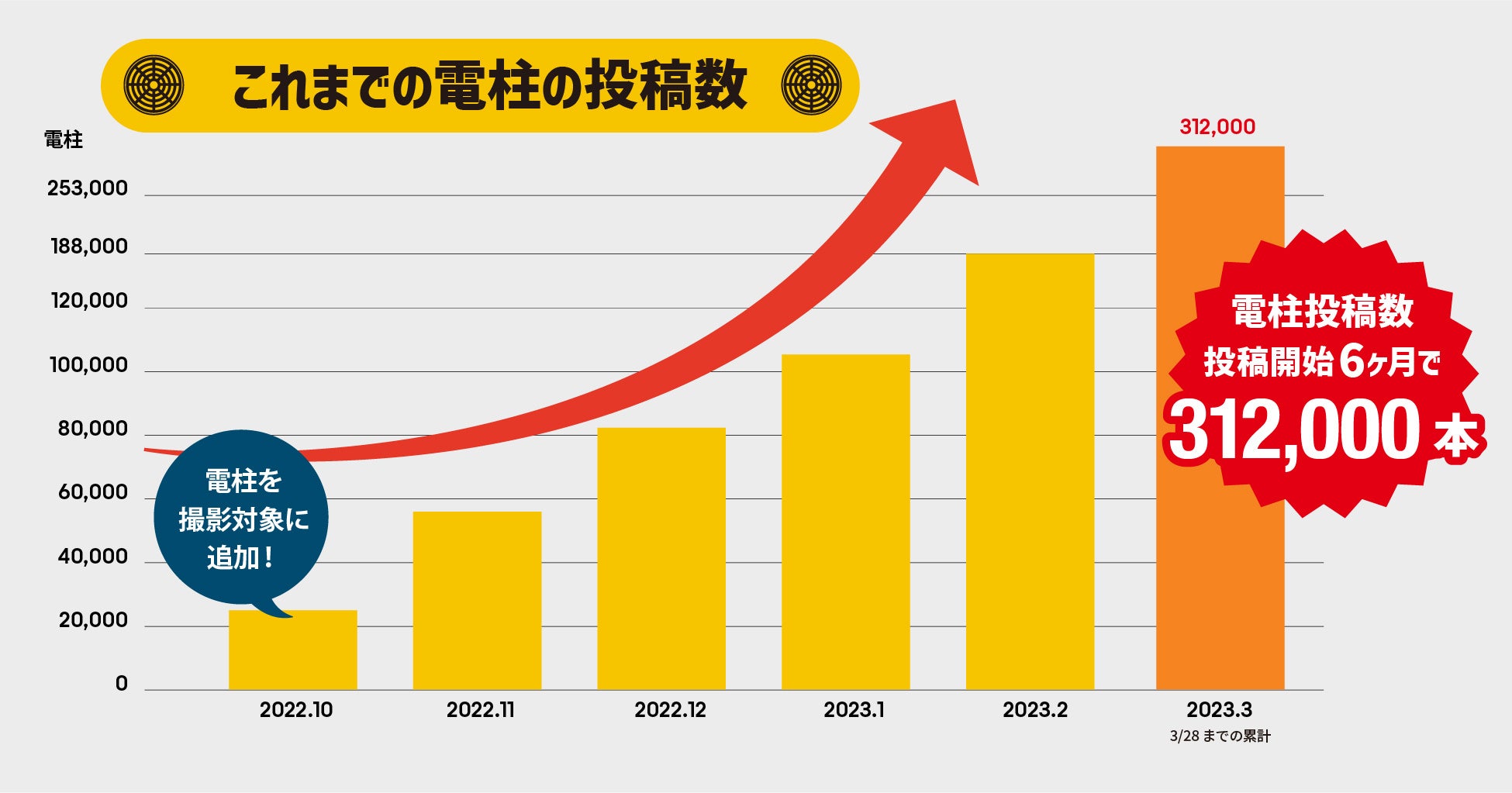 また新たなインフラ撮影対象として昨年10月から加わった電柱は、30万本を超えるデータが集まっています。2月から開始した、電柱を300本撮るとポイントが3倍獲得できるキャンペーンの効果で、1月の10,6000本から約3倍の電柱データが集まりました。