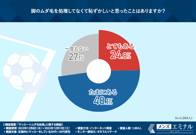 チームメイトについてもその割合が多いことから、定期的にサッカーをしている男性で、脚のムダ毛を処理している方の割合は、一般的な男性と比較して多いといえそうです。